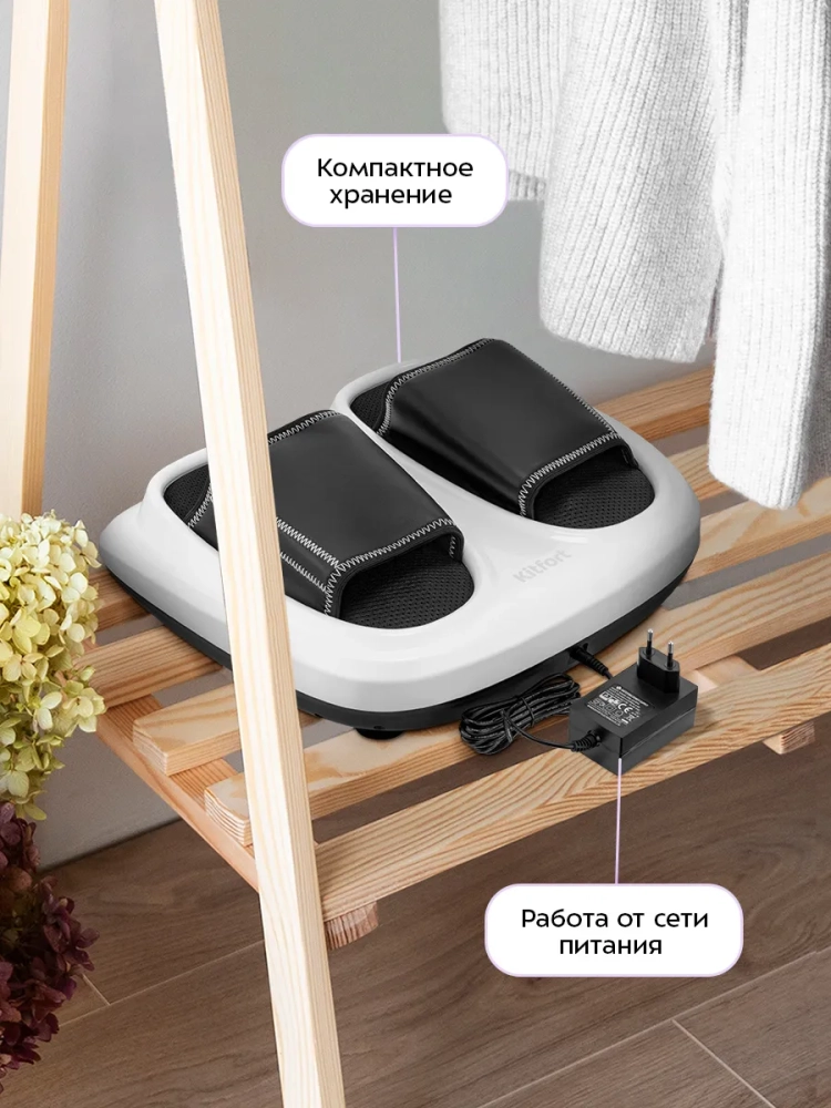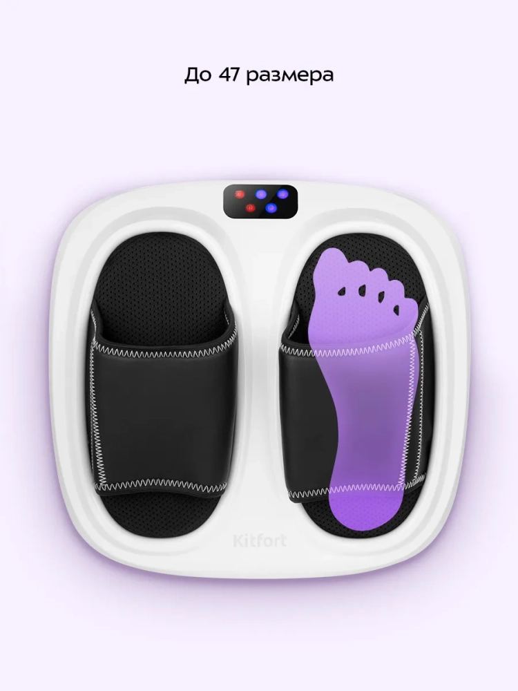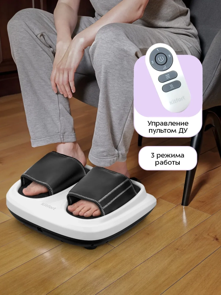 Массажер для ног Kitfort KT-5930 выполнит массаж ваших ног и избавит их от усталости. Прибор сочетает в себе воздушно-компрессионный, вибрационный и роликовый массаж, а также нагрев. Все функции можно использовать по отдельности или комбинируя друг с другом. Управление осуществляется с помощью кнопок на панели управления. В данной модели массажера предусмотрен пульт ДУ.