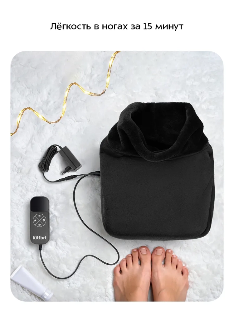 Массажер для ног Kitfort KT-5963 выполнит роликовый массаж ног и согреет их. Нагрев можно отключить или включить снова. Скорость движения роликов (интенсивность массажа) настраивается: вы можете выбрать минимальную, среднюю или максимальную скорость. Длительность массажа — 15 минут. По прошествии этого времени массажер автоматически отключится.