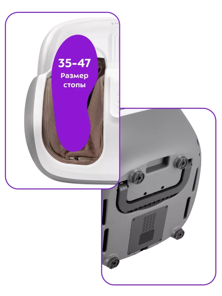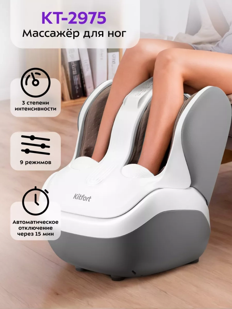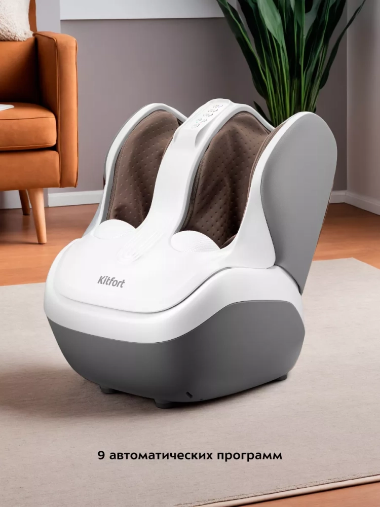 Массажер для ног Kitfort KT-2975 выполнит массаж ваших ног и избавит их от усталости. Прибор сочетает в себе воздушно-компрессионный, вибрационный и роликовый массаж, а также нагрев. Все функции можно использовать по отдельности или комбинируя друг с другом. Управление осуществляется с помощью кнопок на панели управления.