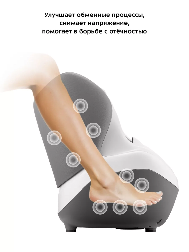 Прибор массирует стопы и икры благодаря колебаниям различной интенсивности. У устройства есть 9 автоматических программ, которые отличаются интенсивностью массажа. Такое разнообразие настроек поможет вам подобрать наиболее комфортный и приятный массаж.