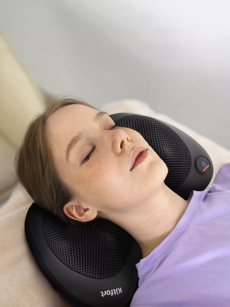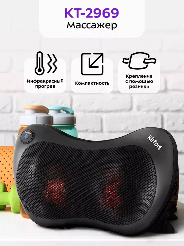 Массажер Kitfort KT-2969 выполняет массаж массажными роликами, помогая избавиться от дискомфорта в шейно-воротниковой зоне, который может возникнуть после долгого сидения за компьютером, неудобной позы во время сна или при сидячем образе жизни. Воздействуя на шею, позвоночник и плечи массажными роликами, массажер устраняет стресс и затекание мышц. Также массажер KT-2969 можно использовать для массажа поясницы, лопаток, бедер и голеней.