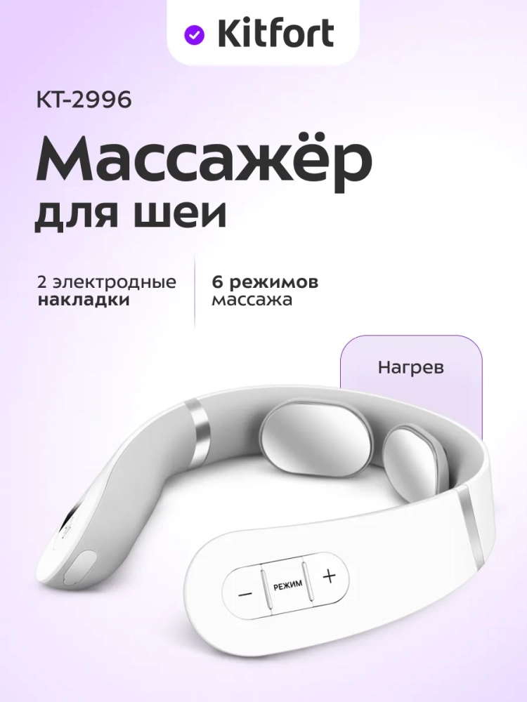Массажер для шеи Kitfort КТ-2996 выполняет массаж шеи электрическими импульсами. Микротоковая стимуляция и воздействие теплом стимулируют мышцы шеи и повышают тонус, расслабляют и снимают усталость, напряжение и болевые ощущения, а также улучшают циркуляцию крови. Благодаря нагреву эффективность массажа повышается и достигается лучшее расслабление мышц шеи. Расслабление мышц шеи и улучшение кровотока также помогают избавиться от головных болей и проблем со сном. Такой массажер отлично подойдет для тех, кто подолгу работает за компьютером или часто испытывает дискомфорт и усталость в области шеи.