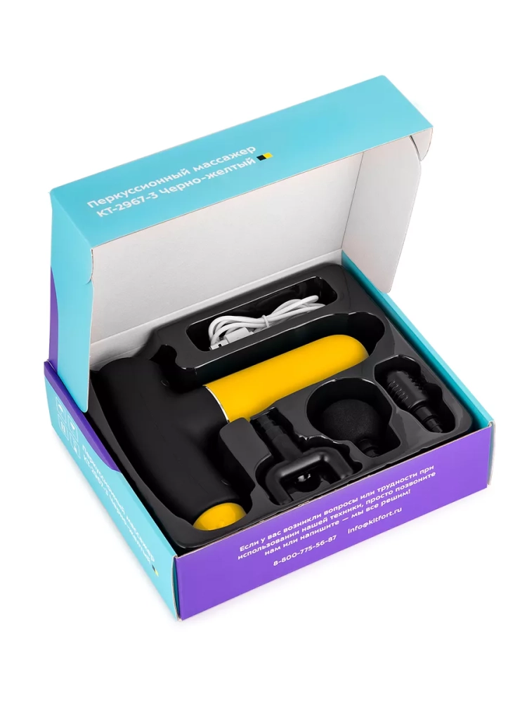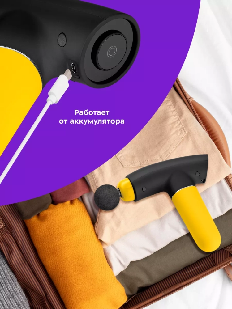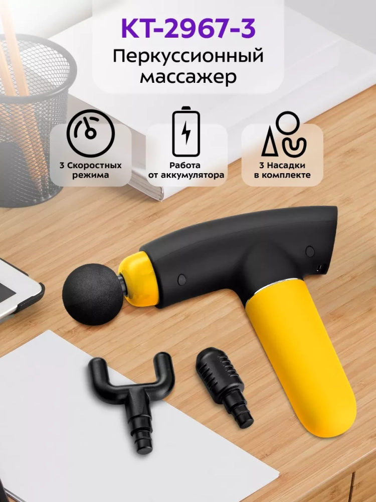 Модель КТ-2967 работает от аккумулятора, поэтому массажер можно брать с собой и использовать в любом удобном месте: в спортзале, в офисе, в поездках, в походах или дома. Можно делать массаж, не снимая одежду. Перкуссионный массажер позволит мышцам расслабиться, а также улучшит кровоток и избавит от боли.