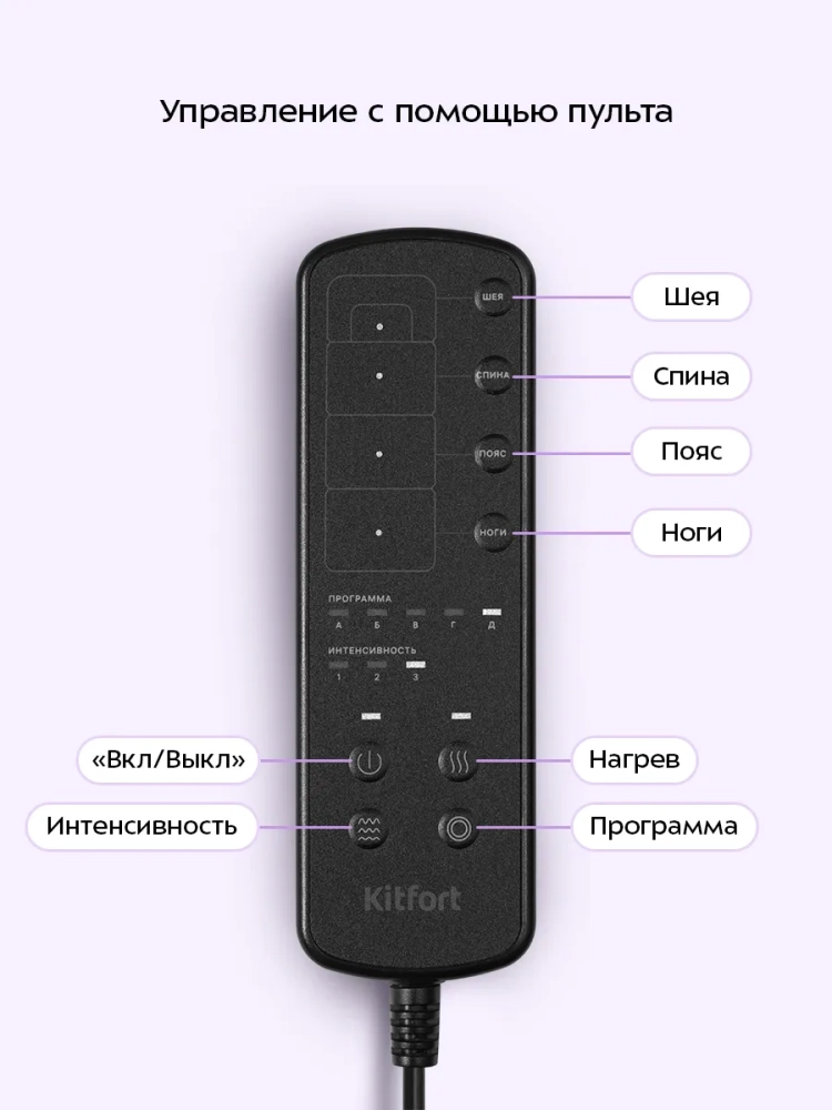 Вы можете вручную изменить интенсивность вибрации и зону массажа (шея, спина, пояс, ноги или все зоны одновременно). Также у прибора есть 5 программ работы, которые отличаются последовательностью зон массажа и временем работы для каждой зоны.