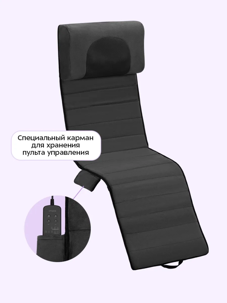 Массажный матрас можно собрать и зафиксировать ремнем для удобного хранения, а пульт управления сложить в специальный карман. Также есть ручка для переноски.