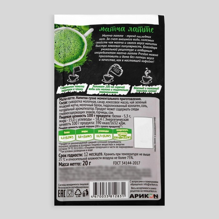Матча-латте - тренд последних лет. За счет внешнего вида, полезных свойств чая матча и своего вкуса напиток быстро завоевал популярность. Благодаря уникальной рецептуре и отборным ингредиентам матча-латте Preston можно приготовить и дома без потери вкуса и качества, как в настоящей кофейне!
