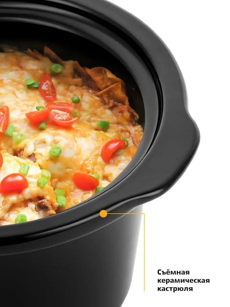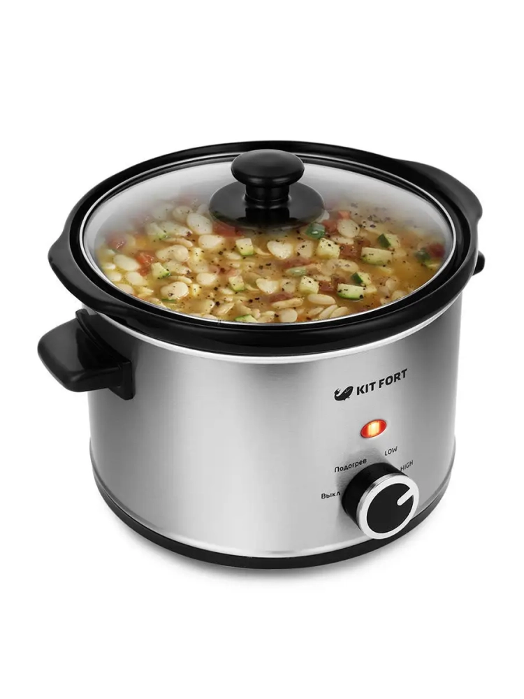 Медленноварка Kitfort КТ-206 — это простой в пользовании кухонный прибор с большим диапазоном применения. Она состоит из двойного корпуса, внутри которого по периметру расположены нагреватели, и керамической кастрюли с крышкой.