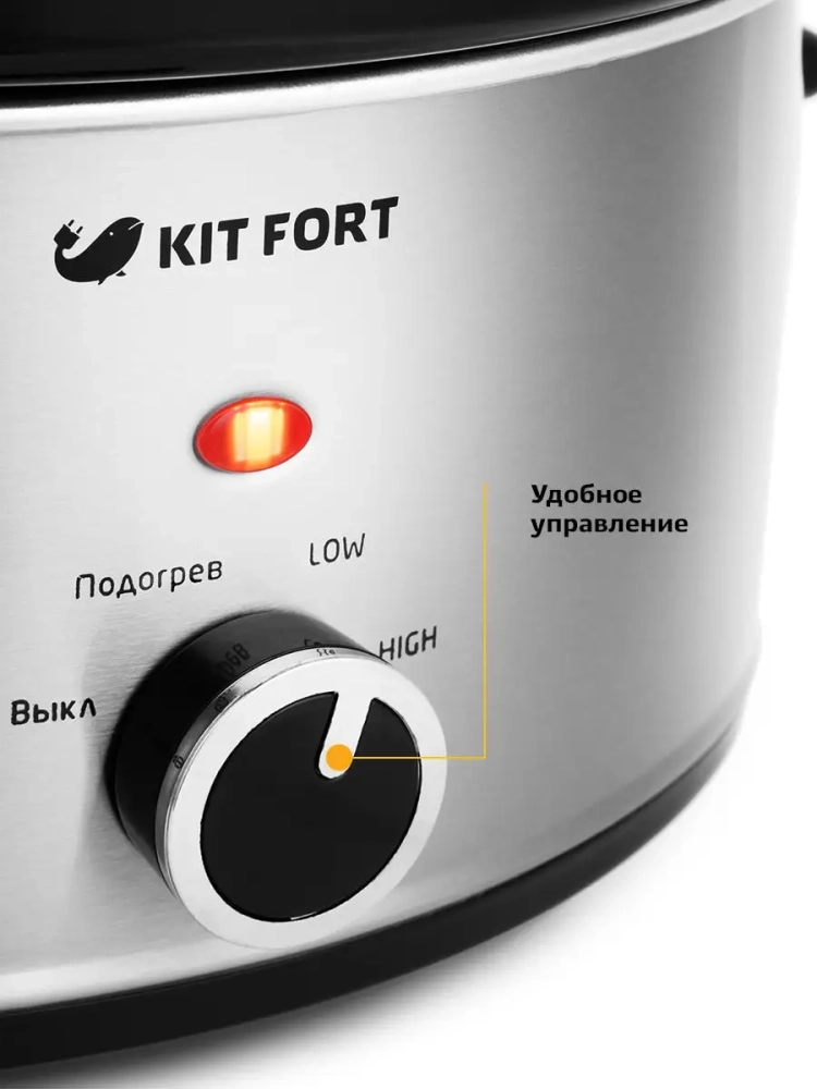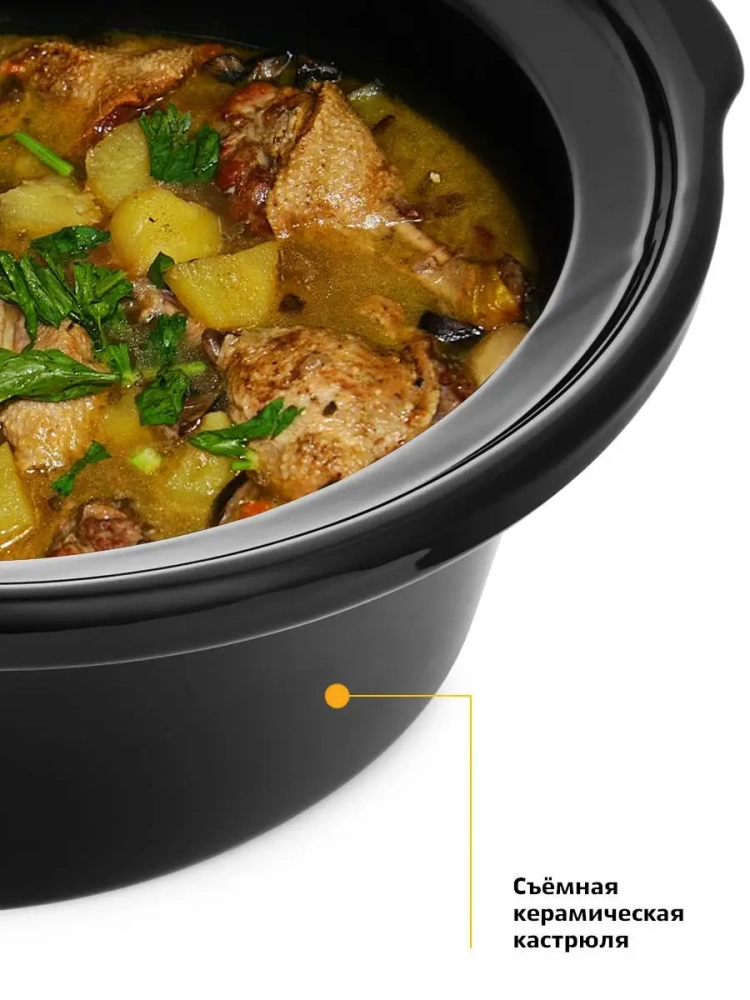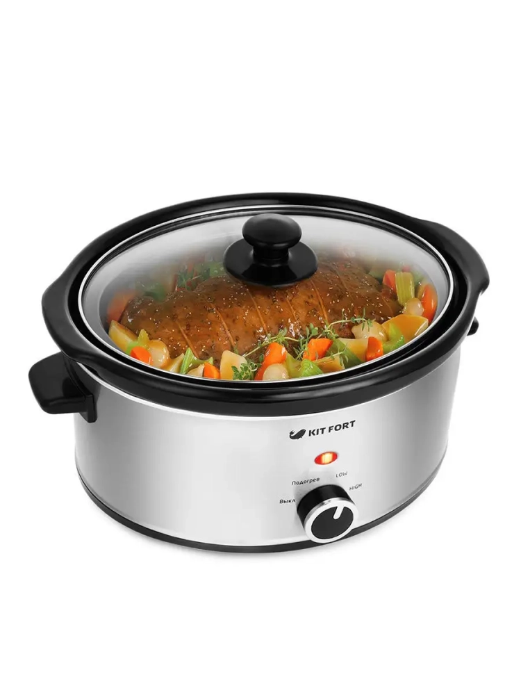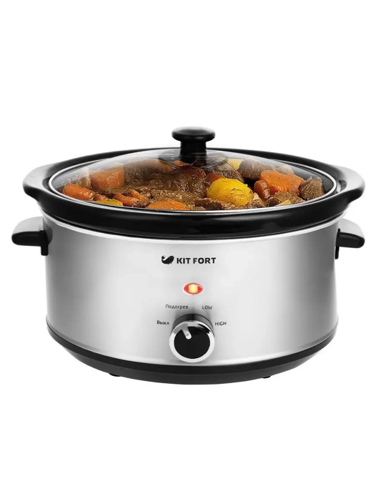 Медленноварка Kitfort КТ-207 — это простой в пользовании кухонный прибор с большим диапазоном применения. Она состоит из двойного корпуса, внутри которого по периметру расположены нагреватели, и керамической кастрюли с крышкой.