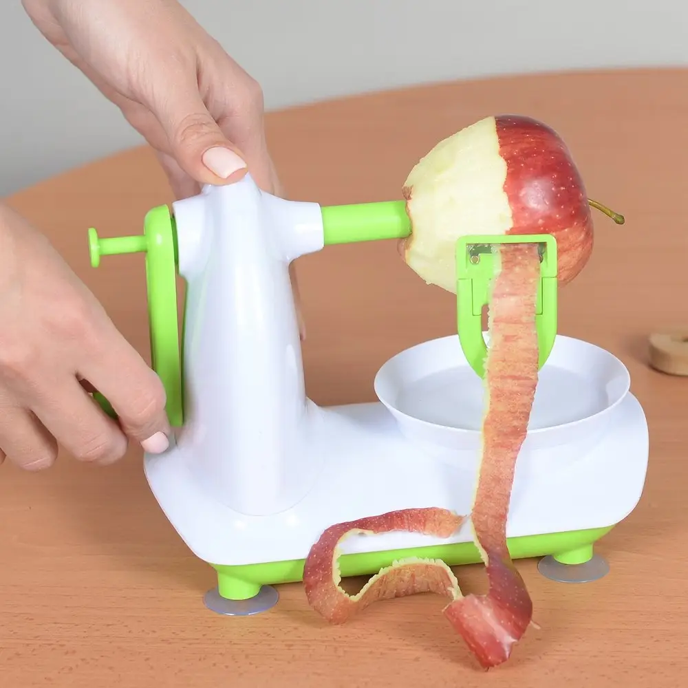Механическая машинка для очистки овощей и фруктов округлой формы (например, для свеклы, картофеля, репы, айвы, яблока и т. п.) поможет быстро очистить продукты от кожицы для приготовления овощных и фруктовых блюд: пирогов, десертов, варенья и т.п. Машинка максимально сэкономит ваше время. И вы по достоинству оцените это! С ее помощью кожица срезается очень тонко, тем самым вы значительно уменьшаете количество отходов и сохраняете большее количество витаминов. Для любителей изящно украшать готовые блюда, это приспособление станет отличным помощником - вы сможете с легкостью почистить фрукты, например, яблоко или свеклу. Для этого достаточно продолжать очищать овощ или фрукт после снятия кожуры, а затем красиво уложить полученные фрукты. Фантазируйте, комбинируя стружки от овощей и фруктов разных цветов и украшайте ваши блюда.