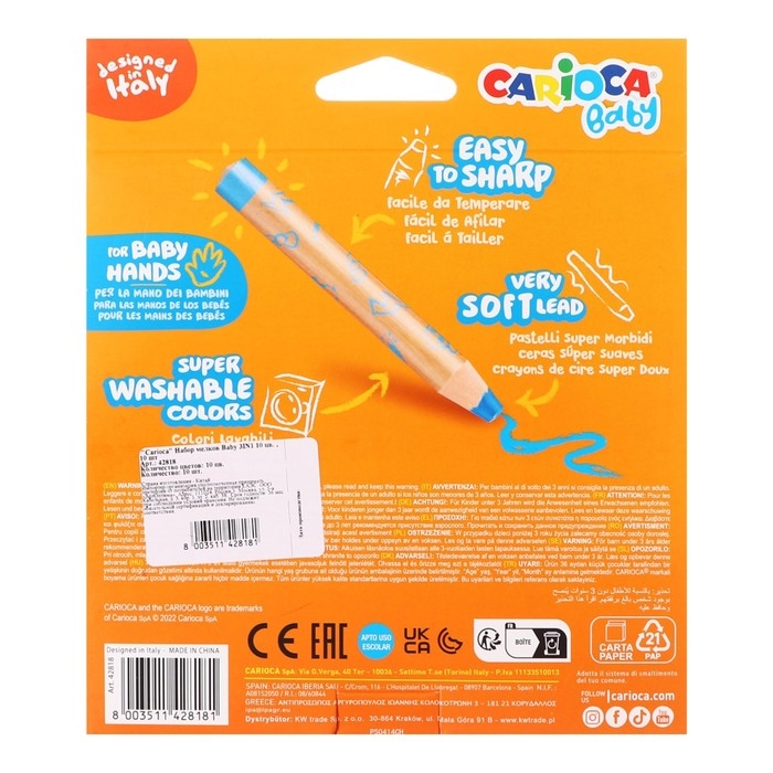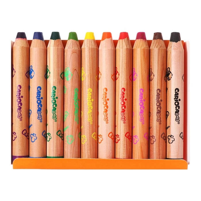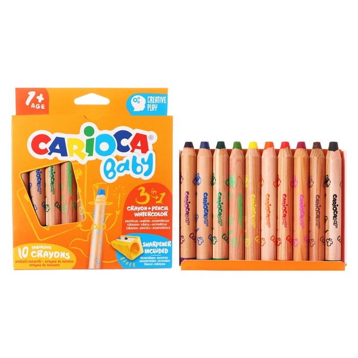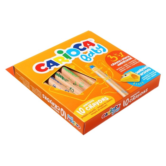 Мелки восковые 10 цветов, Carioca "Baby", 3 в 1, утолщенные корпус, грифель 10 мм, удобные для захвата, яркие цвета, точилка в подарок, для малышей