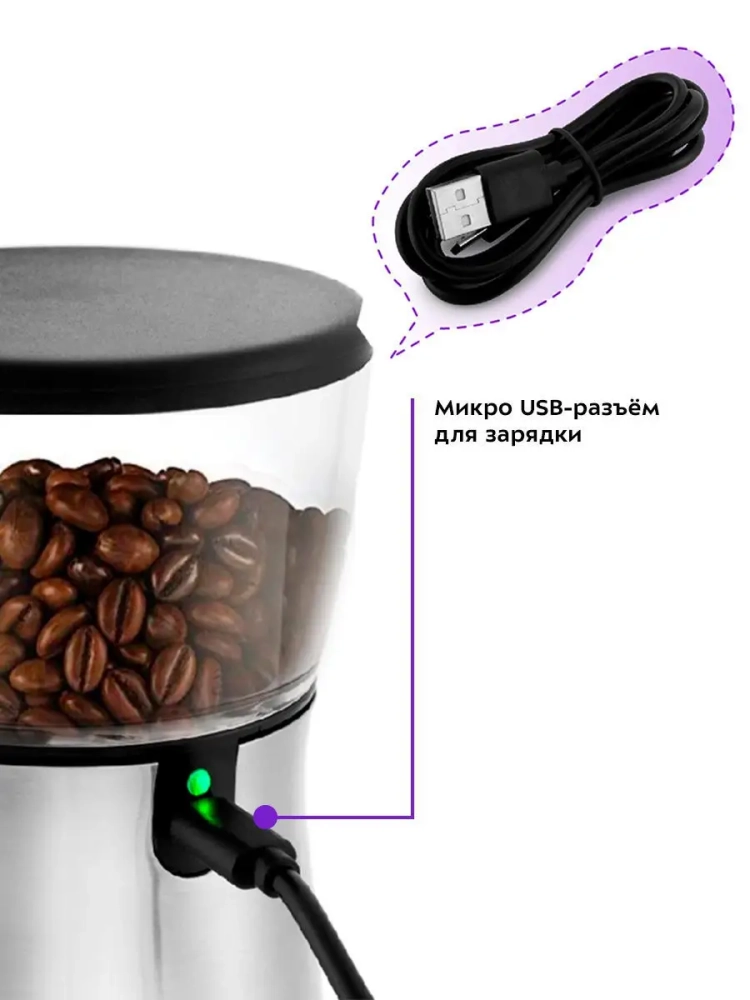 Мельница для кофе Kitfort KT-723 предназначена для помола кофейных зёрен. Для измельчения кофейных зёрен в нее встроены керамические жернова, благодаря которым помол получается однородным, а так же исключают возможность пережигания зерна. Степень помола меняется регулятором. Мельница заряжается от розетки или от съёмного аккумулятора и имеет micro USB-разъём. Чтобы начать работу мельницы, просто нажмите на выключатель. Мельница будет работать, пока вы его не отожмёте.
