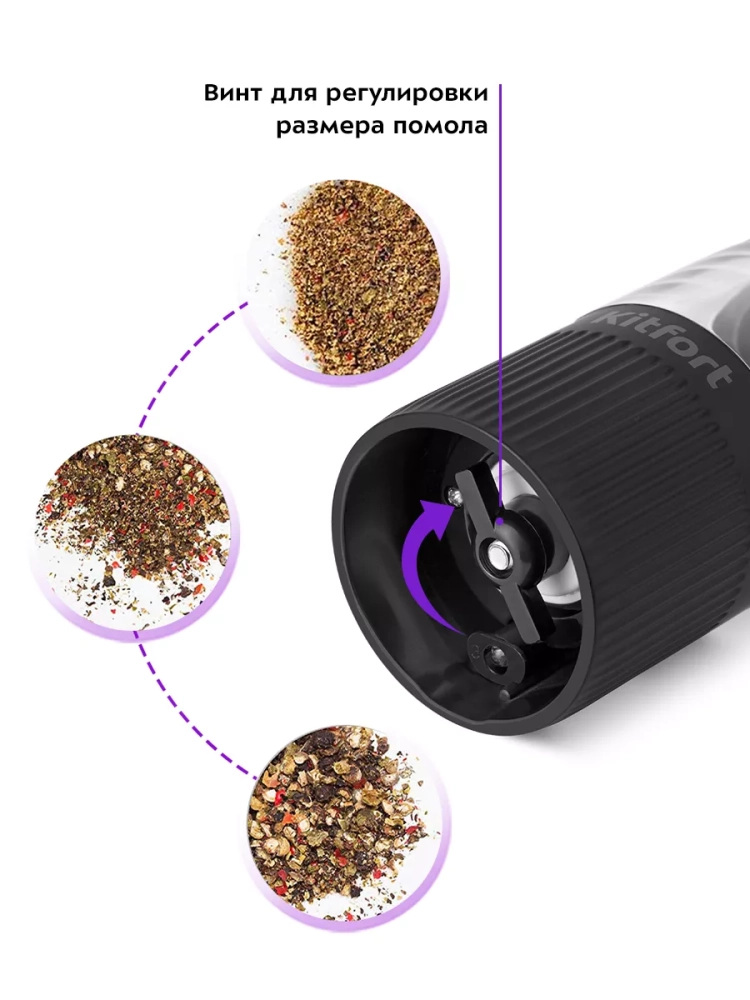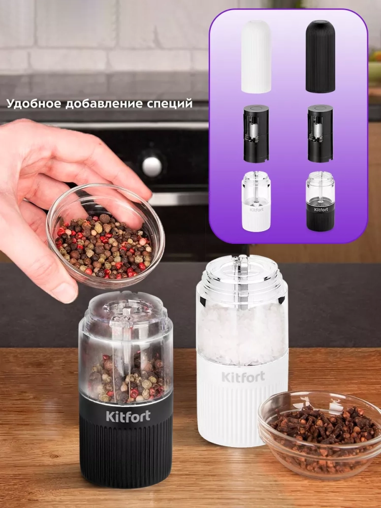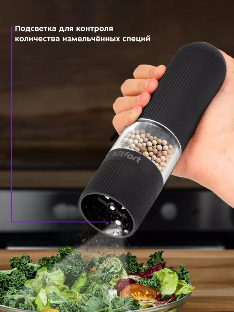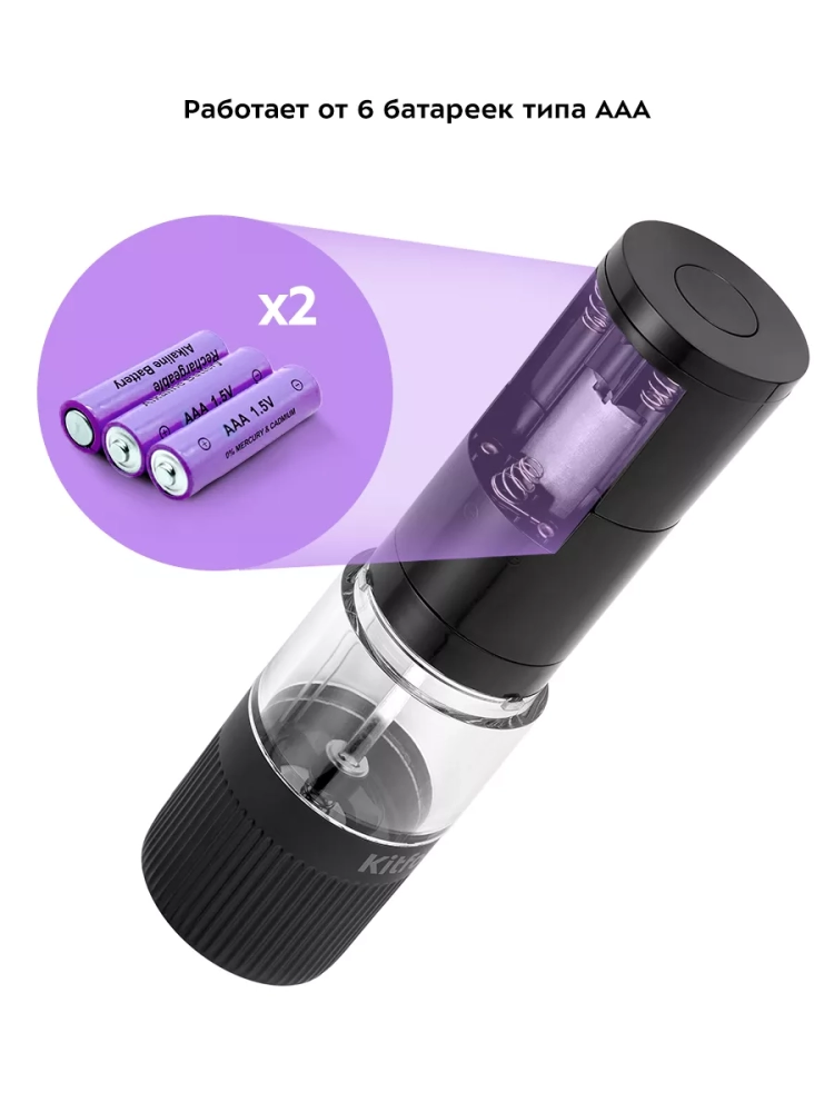 Электрическая мельница Kitfort КТ-6003 измельчает перец-горошек, соль и другие специи. Степень помола регулируется винтом. Устройство имеет конические жернова из керамики, они долговечные, не стираются и не ржавеют. Мельница удобно лежит в руке, включается одной кнопкой и работает от 6 батареек типа ААА, которых хватает на долгое время. Батарейки в комплект не входят.