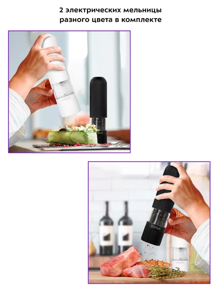 Поскольку чаще всего из специй используют соль и перец, в комплект входят две мельницы разного цвета. Вы можете использовать набор мельниц как солонку и перечницу на столе, и у вас будет возможность добавить в готовые блюда свежемолотые специи. В отличие от специй, которые хранятся в уже измельченном виде, свежемолотые специи имеют более яркий и насыщенный вкус и аромат.
