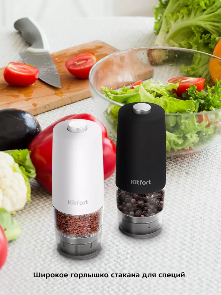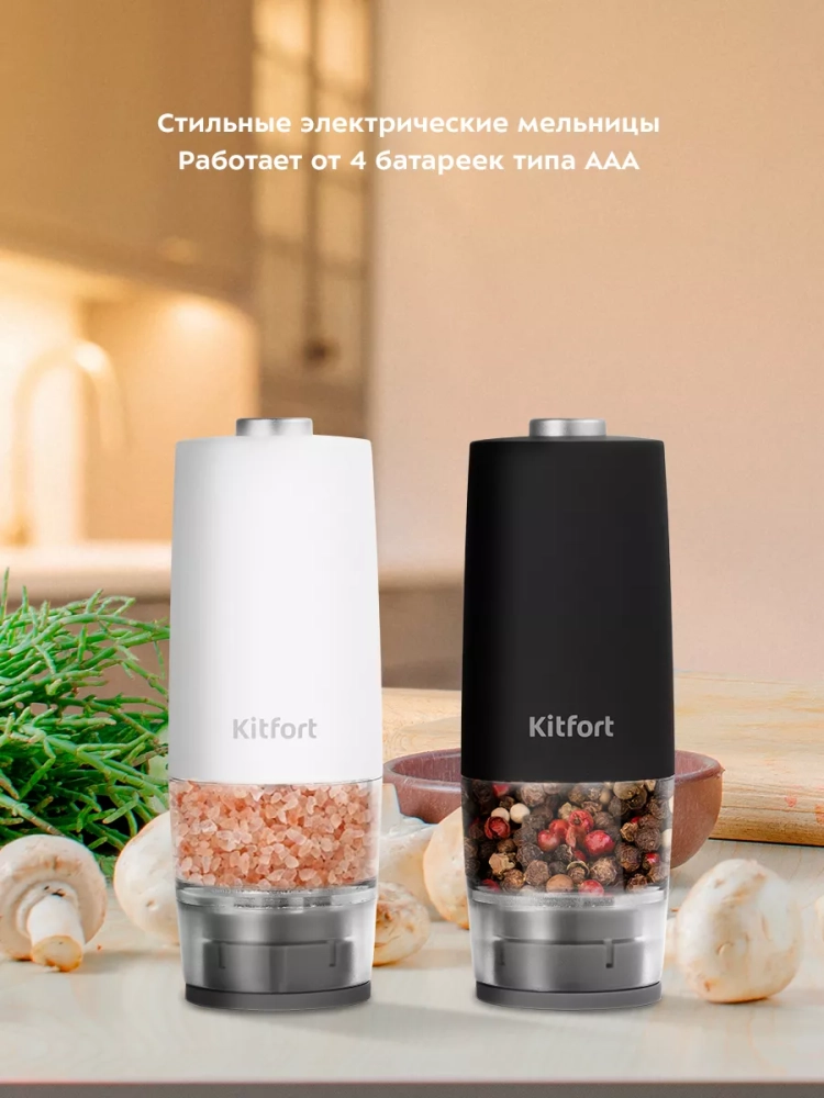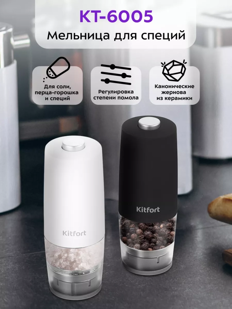 Электрическая мельница Kitfort КТ-6005 измельчает перец-горошек, соль и другие специи. Степень помола регулируется винтом. Устройство имеет конические жернова из керамики, они долговечные, не стираются и не ржавеют. Мельница удобно лежит в руке, включается одной кнопкой и работает от 4 батареек типа ААА, которых хватает на долгое время. Батарейки в комплект не входят.