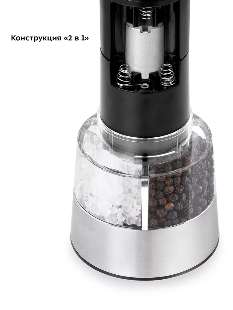 Устройство имеет конструкцию «2 в 1»: емкость для специй разделена на две части для измельчения двух видов специй. Мельница выполнена из сочетания пластика и нержавеющей стали с прозрачной емкостью для специй, что позволит следить за количеством содержимого в ней.