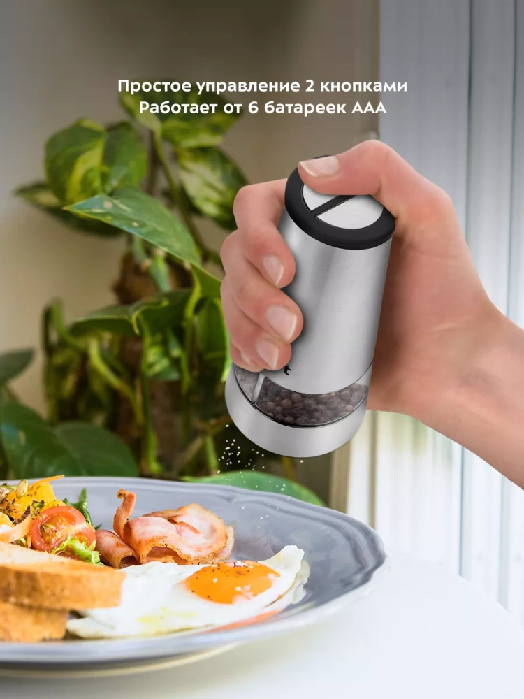 Степень помола для каждого вида специй регулируется винтом. Устройство имеет конические жернова из керамики, они долговечные, не стираются и не ржавеют. Мельница удобно лежит в руке, имеет простое управление двумя кнопками и работает от 6 батареек типа ААА, которых хватает на долгое время. Батарейки в комплект не входят.