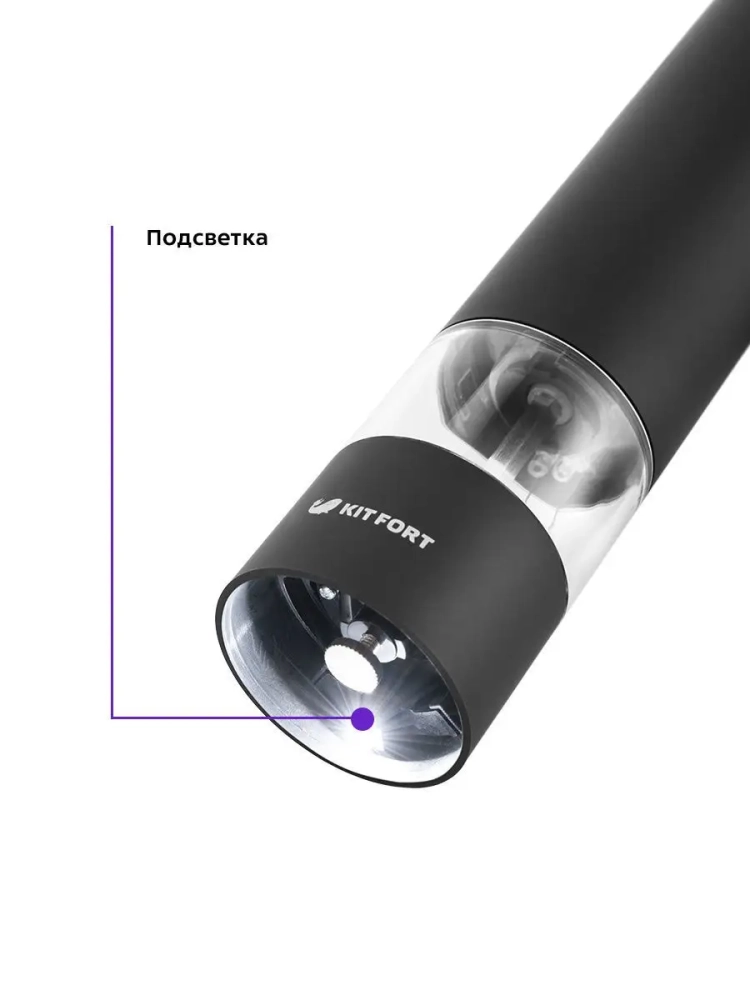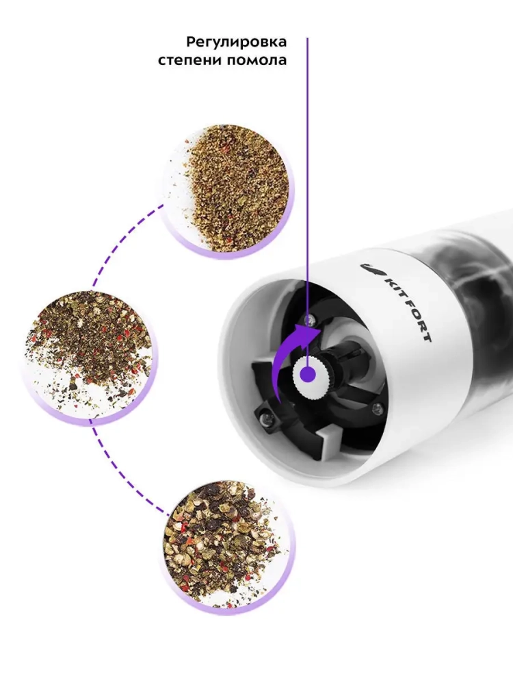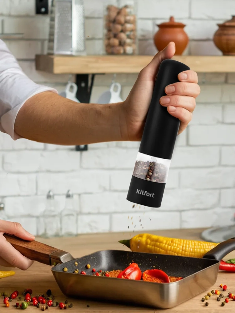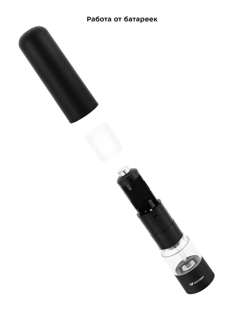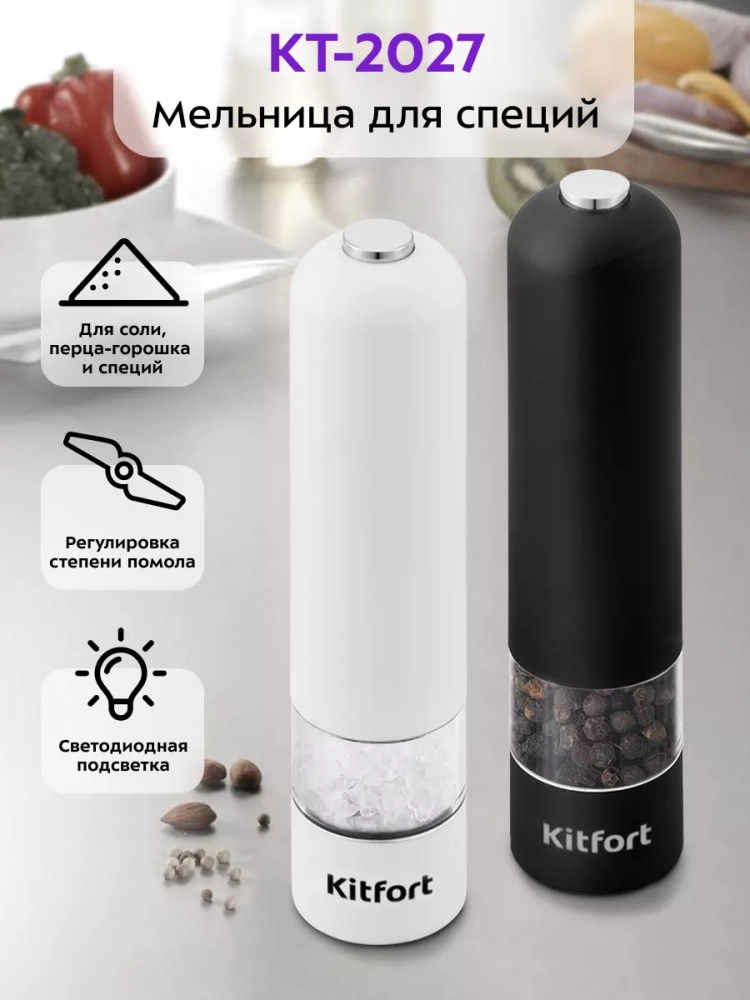 Электрическая мельница Kitfort KT-2027 измельчает перец-горошек, соль и другие специи. Степень помола регулируется винтом. Установлены конические жернова из керамики, они долговечные, не стираются и не ржавеют. Мельница удобно лежит в руке, включается одной кнопкой и работает от 4 батареек типа АА, которых хватает на долгое время. Нет нужды молоть специи впрок. Мельница одновременно мелет и дозирует. Поместите ее над блюдом и нажмите кнопку. Во время помола снизу загорается светодиод, он освещает блюдо, чтобы вам было лучше видно количество специй. Поскольку чаще всего из специй используют соль и перец, мы положили в комплект две мельницы. Вы можете использовать набор мельниц как солонку и перечницу на столе, и у вас будет возможность посыпать готовые блюда свежемолотыми специями.
