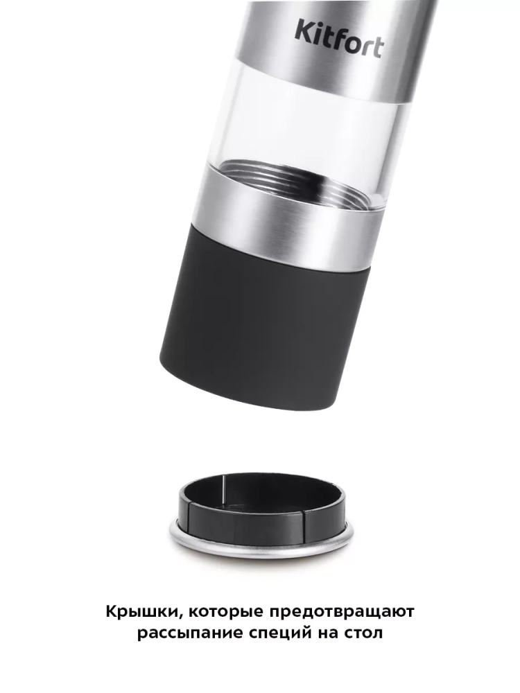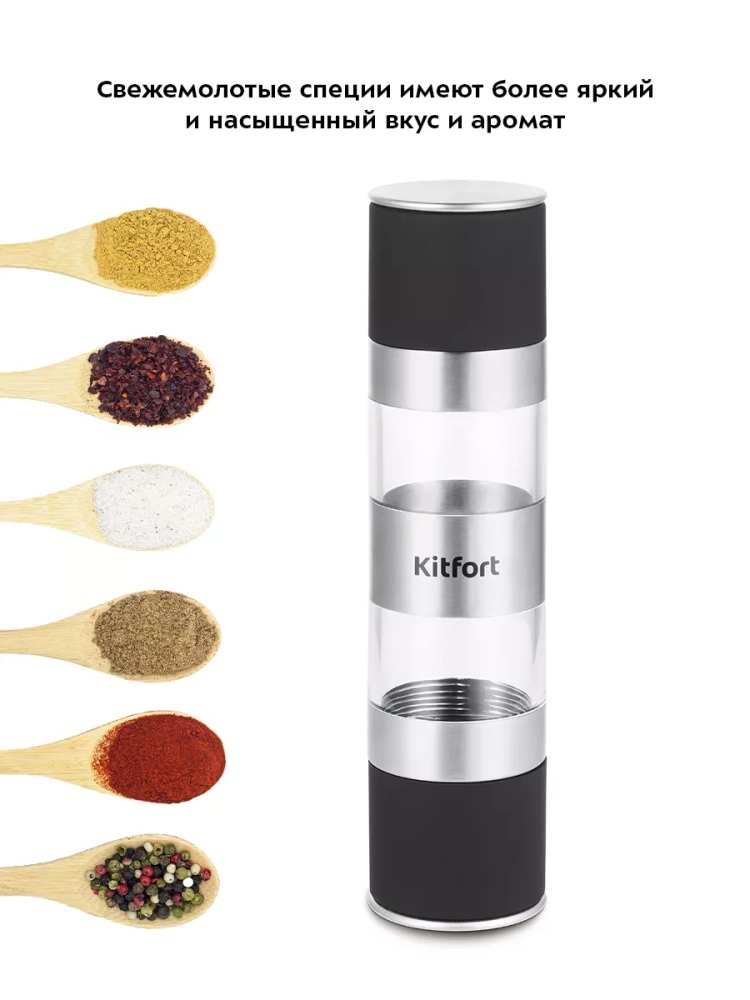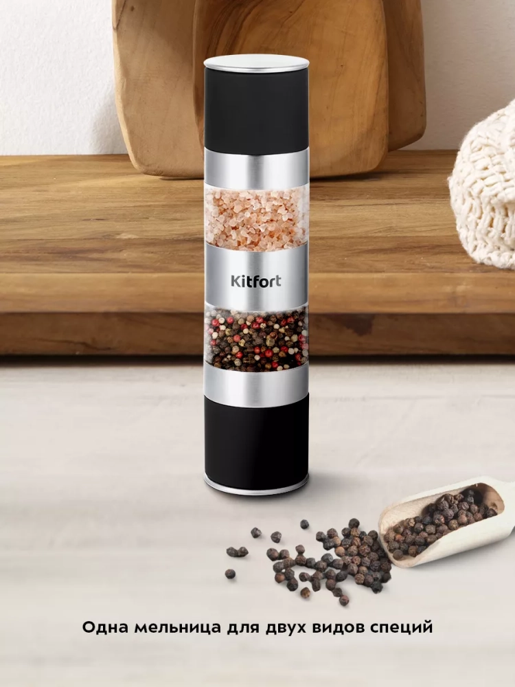 Мельница для соли и перца Kitfort КТ-6008 является двухсторонней механической мельницей, которая измельчает перец-горошек, соль и другие специи. Степень помола регулируется винтом. Устройство имеет конические жернова из керамики, они долговечные, обеспечивают однородный помол, не подвержены коррозии и не ржавеют.