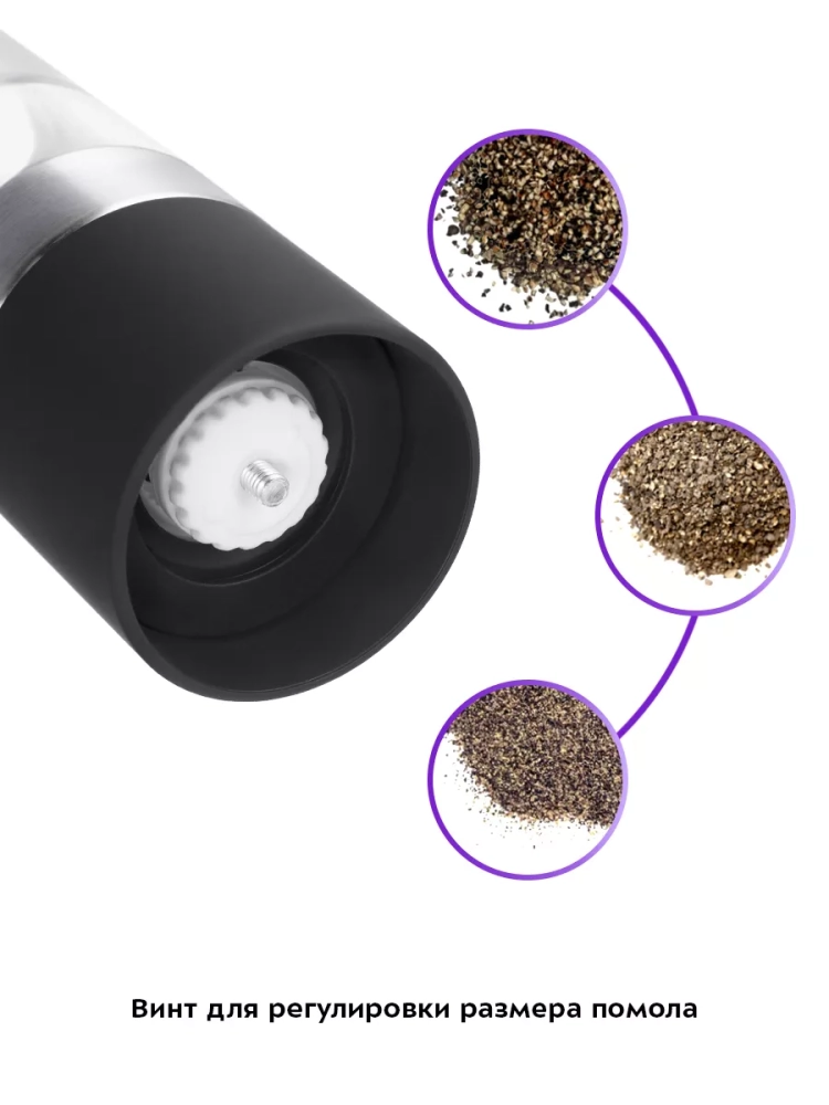 Мельница выполнена из сочетания пластика и нержавеющей стали с прозрачными емкостями для специй, что позволит следить за количеством содержимого в них. Широкое горлышко емкостей для специй обеспечивает легкое и удобное заполнение мельницы специями.