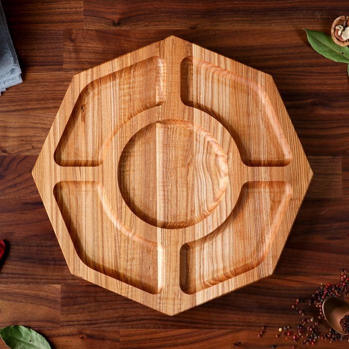 Деревянная менажница имеет свой уникальный стиль и красоту. Она изготовлена из натурального дерева, что придает ей шарм и теплоту.