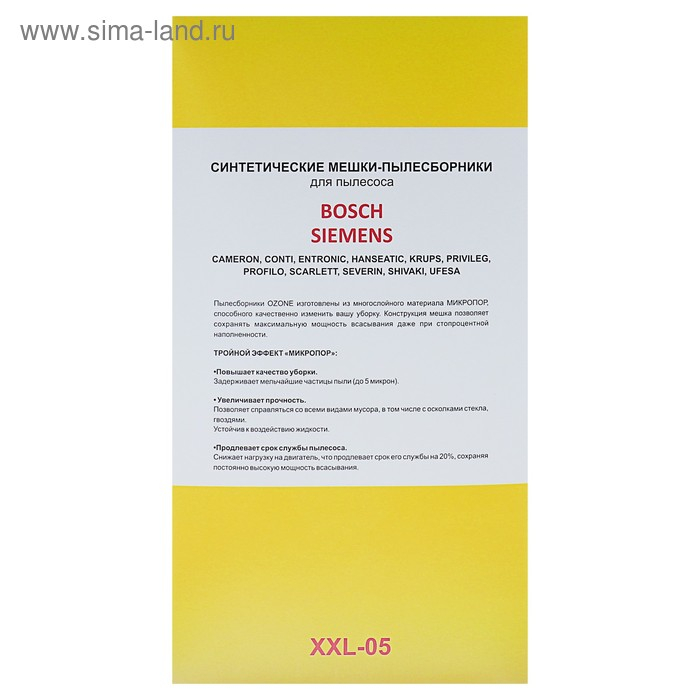 Мешки-пылесборники Ozone являются сменным аксессуаром для пылесосов. Представляют собой первую ступень очистки, удерживая основную массу мусора и пыли. Синтетический белый материал мешков электризует мельчайшие частицы пыли, три слоя волокнистой структуры обеспечивают гипоаллергенные характеристики и улучшенную фильтрацию, задерживая частицы размером от 0.3 мкм. Рамка изготовлена из плотного картона, резиновое кольцо-уплотнитель плотно фиксирует мешок на месте.
