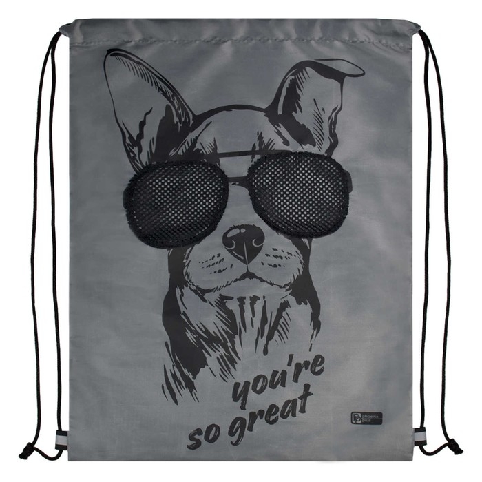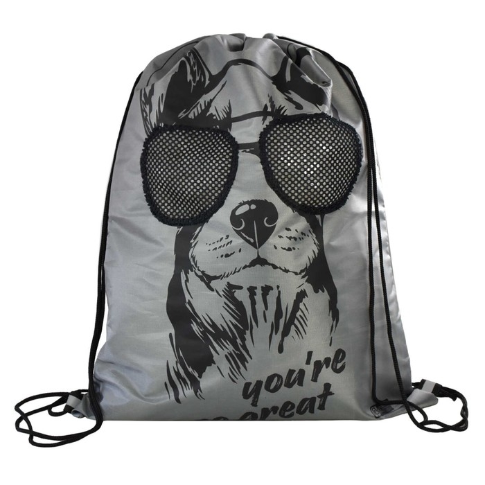Мешок для сменной обуви. СОБАКА В ОЧКАХ. Размер: 36х48 см. Материал: полиэстер. Количество отделений - 1. Застёжка - шнурок. Отделка: окно из сетки, шелкография. Особенности: светоотражающие элементы. Подклада: нет. Пол: универсальный. Индивидуальная упаковка: ПЭТ-пакет.