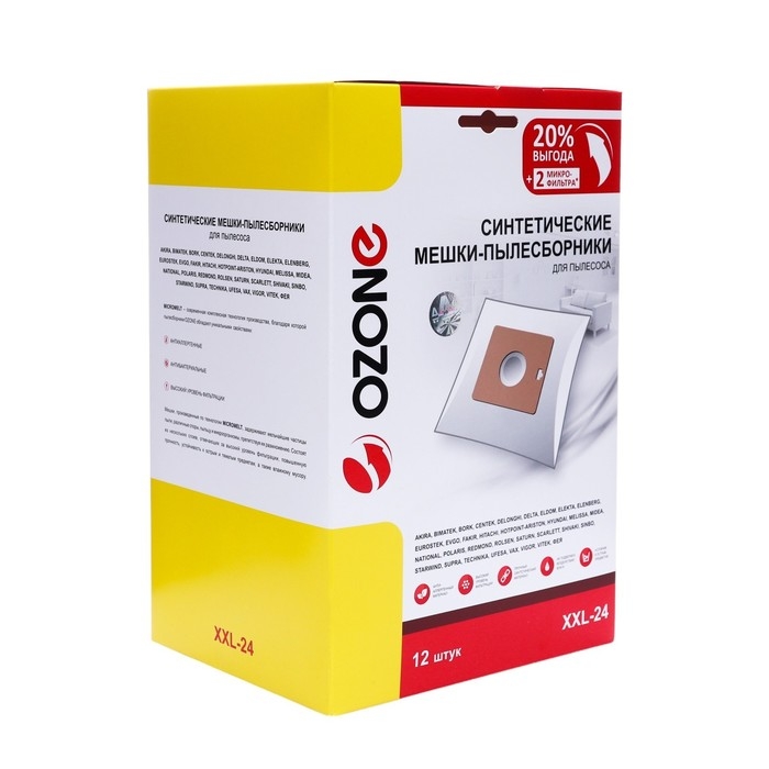 Мешок-пылесборник XXL-24 Ozone синтетические для пылесоса, 12 шт + 2 микрофильтра - это высококачественные аксессуары для поддержания чистоты в вашем доме. Они изготовлены из прочного и долговечного синтетического материала, который способен удерживать мельчайшие частицы пыли и грязи, обеспечивая тем самым высокое качество уборки.