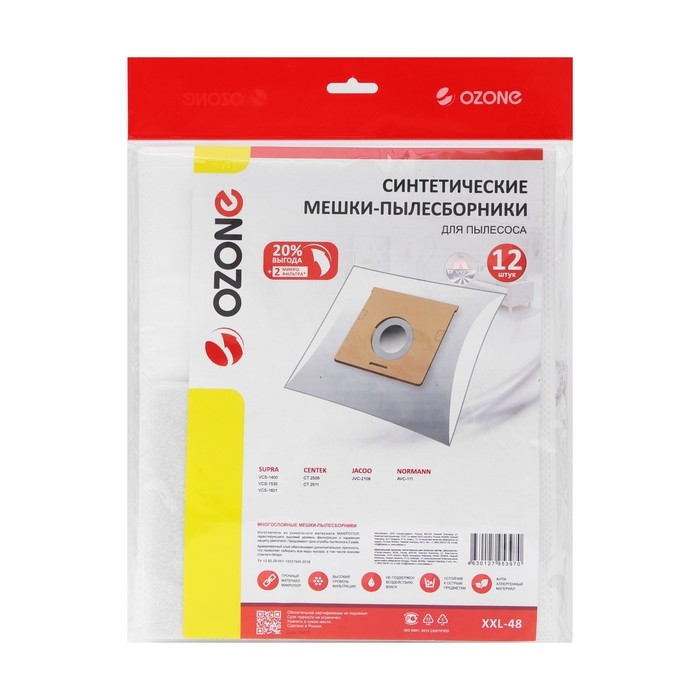 Мешок-пылесборник XXL-48 Ozone синтетические для пылесоса, 12 шт + 2 микрофильтра