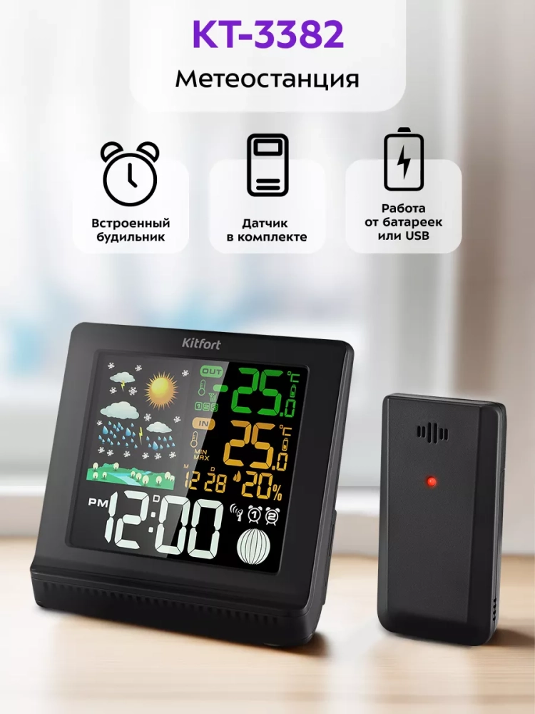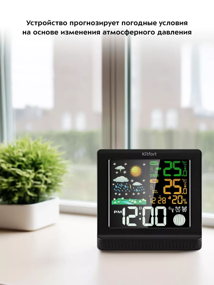 Метеостанция Kitfort KT-3382 — это прибор, который позволит следить за показаниями температуры и влажности в помещении, температурой на улице, атмосферным давлением, а также фазой луны. Есть возможность выбрать единицы измерения температуры: градусы Цельсия (°С) или Фаренгейта (°F). Единицы измерения атмосферного давления — гектопаскали. Устройство прогнозирует погодные условия на основе изменения атмосферного давления.