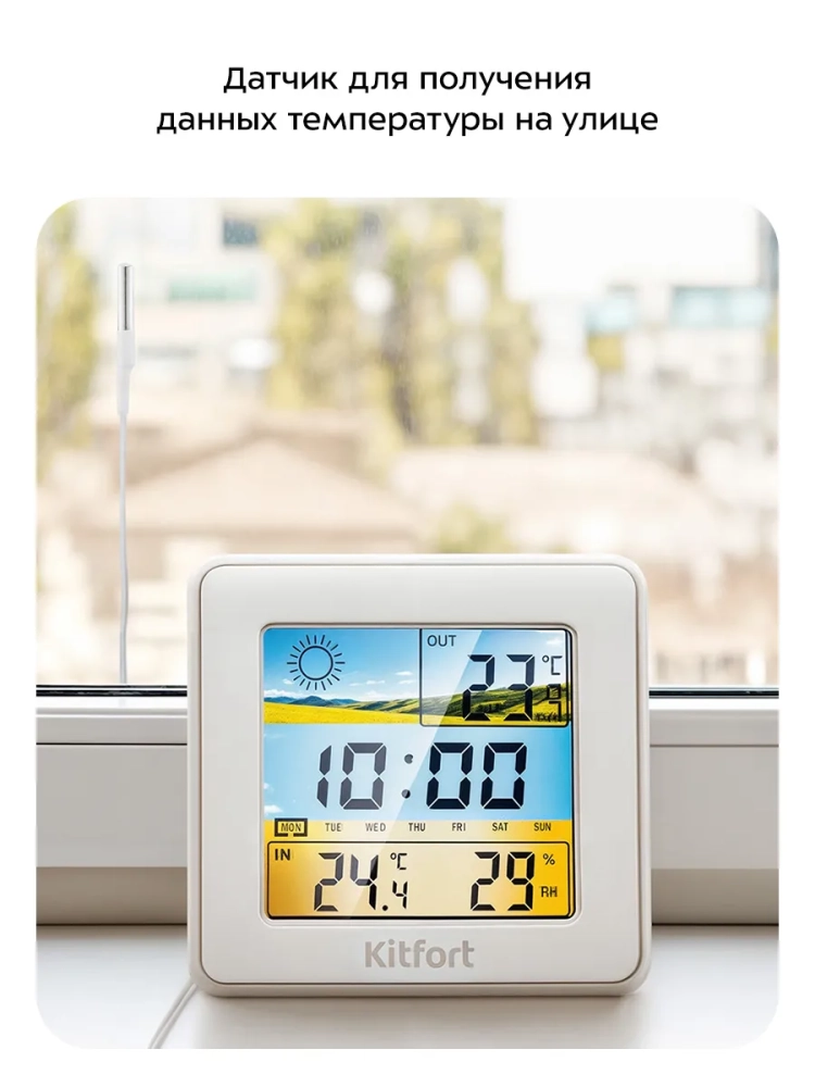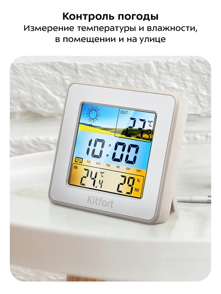 Метеостанция Kitfort KT-3709 — это прибор, который позволит следить за показаниями температуры и влажности в помещении, а также температурой на улице. Температура может отображаться в градусах Цельсия или градусах Фаренгейта.