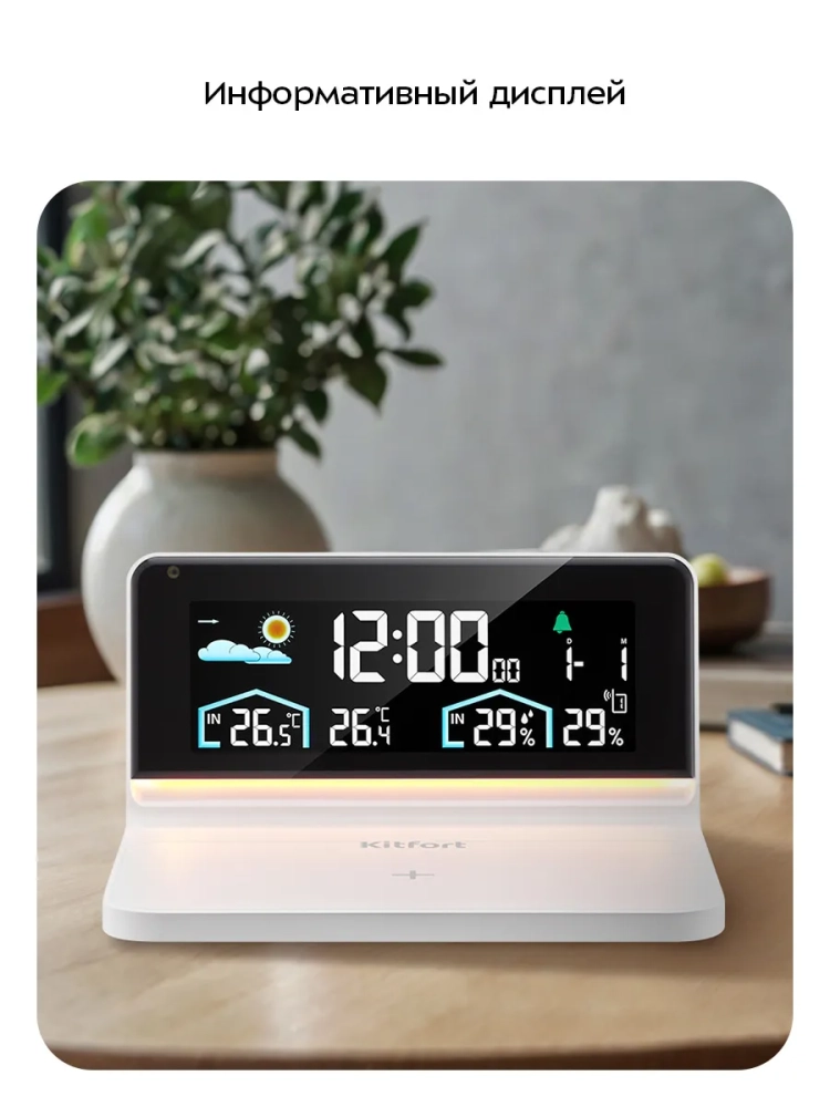 Метеостанция Kitfort КТ-3732 — это современное устройство для точного измерения погодных условий дома и на улице. Эта домашняя метеостанция оснащена беспроводным уличным датчиком, который позволяет получать данные о погоде с высокой точностью. Уличный датчик передает информацию на станцию, обеспечивая удобный мониторинг погодных условий в реальном времени.