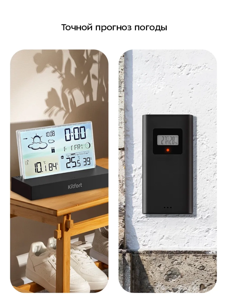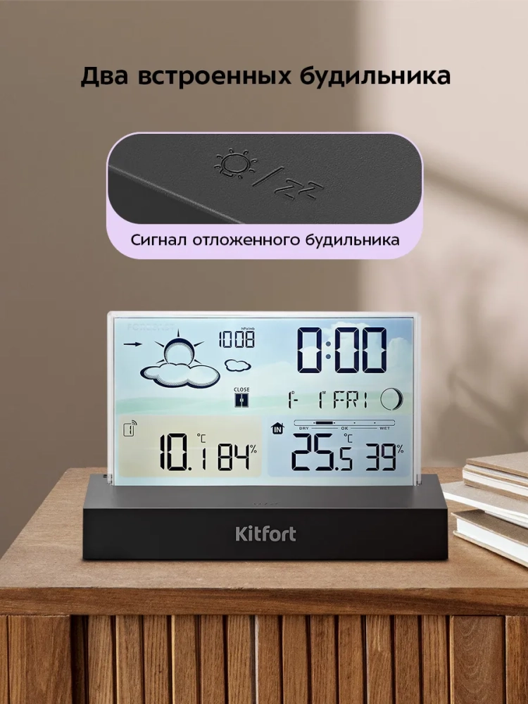 Метеостанция Kitfort KT-3737 — это прибор, который позволяет регулярно отслеживать температуру и влажность воздуха в помещении и на улице, а также контролировать атмосферное давление и его динамику. Температура может отображаться в градусах Цельсия (°С) или Фаренгейта (°F). В качестве единицы измерения атмосферного давления можно выбрать гектопаскаль (hPa)/миллибар (mb) или дюйм ртутного столба (inHg). Устройство прогнозирует погодные условия на ближайшие 12 часов на основе изменения атмосферного давления.