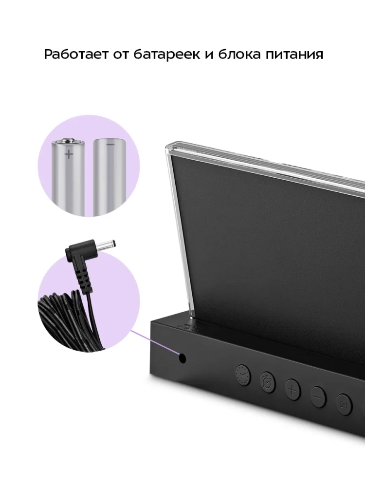 Устройство подключается к источнику питания с помощью блока питания из комплекта. Метеостанция может работать также от 2 батареек типа AАА (в комплект не входят), благодаря чему ее можно расположить в любом удобном для вас месте.