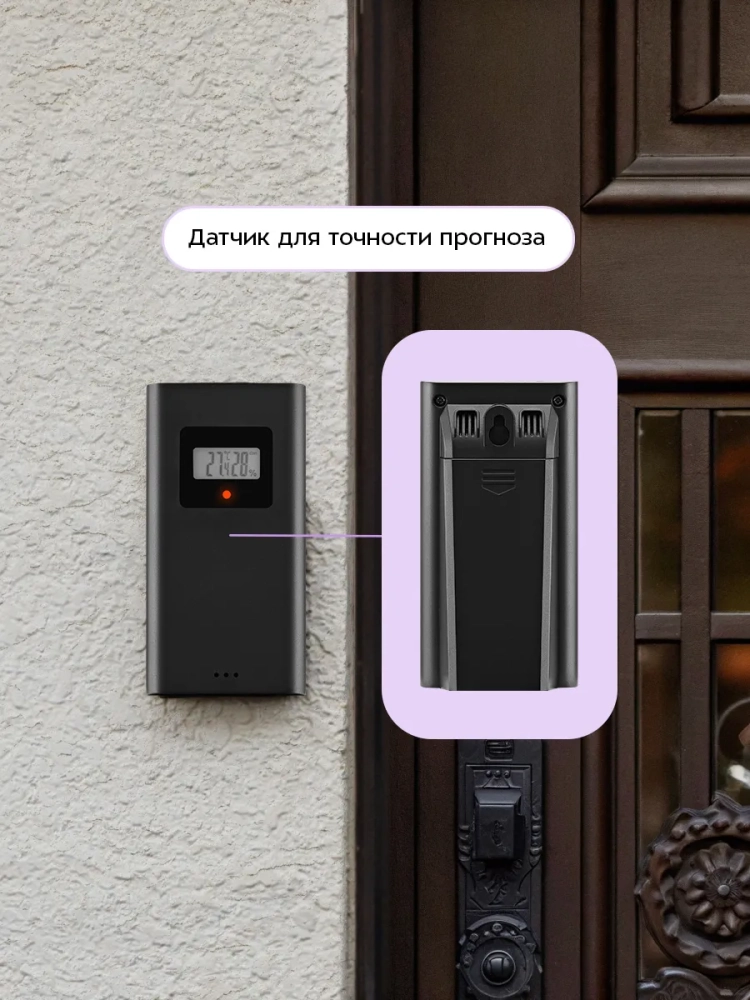 Метеостанция оснащена датчиком для получения показаний температуры и влажности на улице или в других помещениях. Датчик работает от 2 батареек типа AAА (в комплект не входят). Благодаря дисплею датчик может использоваться и без метеостанции: температура и влажность воздуха в месте расположения датчика отображается на его дисплее. К устройству можно подключать до трех датчиков (в комплект входит один).