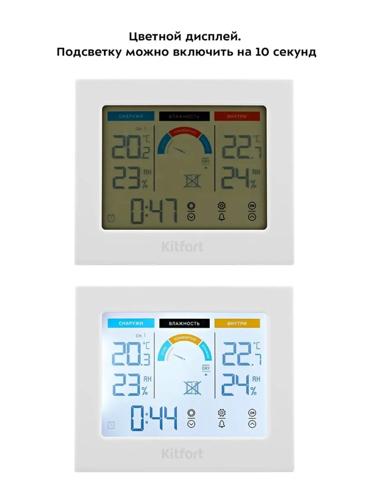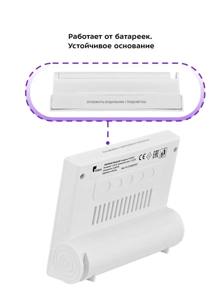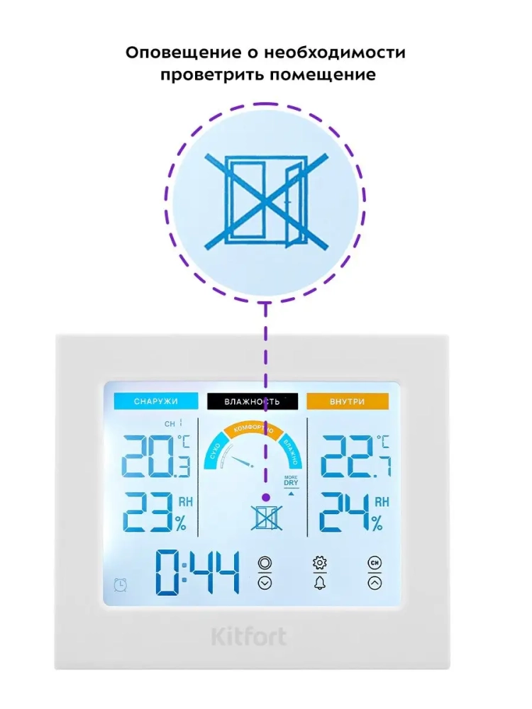 Метеостанция Kitfort KT-3317 — это прибор, который позволит следить за показаниями температуры и влажности в помещении и на улице. Также KT-3317 показывает время и может служить будильником. Сигнал будильника можно отложить на 5 минут. Метеостанция показывает максимальные и минимальные значения температуры и влажности в помещении и на улице за сутки. Вы поймете, когда нужно проветрить комнату или стоит закрыть окно, благодаря индикатору «Окно». Данный индикатор основан на связи показаний индикатора изменения влажности и индикатора влажности, которые также видны на дисплее метеостанции. Индикатор изменения влажности использует показания влажности в помещении и на улице, чтобы показать, как проветривание повлияет на влажность в помещении. У прибора цветной дисплей, на котором хорошо видны все необходимые значения. Подсветку можно включить на 10 секунд. Метеостанция работает от 2 щелочных батареек типа AAA (не входят в комплект), благодаря чему ее можно расположить в любом удобном для вас месте. Устройство устойчиво стоит на столе благодаря широкому основанию. Данная модель оснащена одним датчиком для получения показаний температуры и влажности на улице. Датчик можно повесить на стену, для этого предусмотрено отверстие для настенного крепления. Вы можете поместить датчик не на улице, а в другом помещении, но в этом случае индикатор «Окно» не будет показывать актуальную информацию. Питание датчика происходит от 2 щелочных батареек типа AAA (не входят в комплект). Благодаря стильному дизайну и компактному размеру метеостанция легко впишется в ваш интерьер.