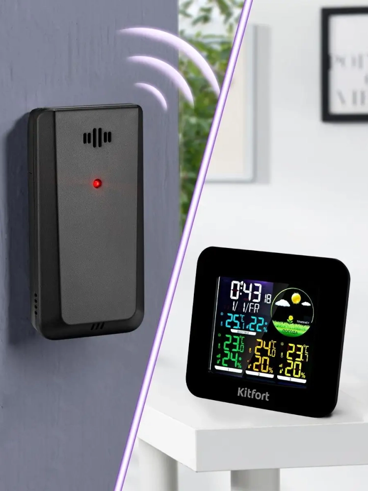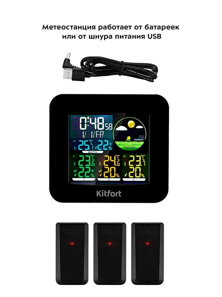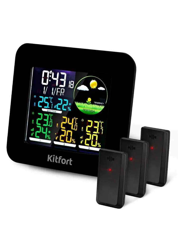 Метеостанция Kitfort KT-3321 — это прибор, который позволит следить за показаниями температуры и влажности в помещении и на улице, погодой. Устройство прогнозирует погодные условия на ближайшие 12–24 часа на основе изменения атмосферного давления. Также KT-3321 показывает время, дату, день недели и может служить будильником. Сигнал будильника можно отложить на 5 минут. Метеостанция показывает максимальные и минимальные значения температур и влажности за сутки, тенденцию изменения температуры, влажности и атмосферного давления: повышение, понижение, без изменений. У прибора цветной дисплей, который имеет 3 уровня яркости подсветки. Метеостанция может работать как при подключении к источнику питания через шнур USB (входит в комплект), так и от 3 щелочных батареек типа AAA (не входят в комплект). Прибор можно повесить на стену или поставить на стол. На задней части устройства расположены отверстия для настенного крепления и складные ножки. Данная модель оснащена 3 датчиками для получения показаний температуры и влажности на улице или в двух других помещениях, например, детской комнате, теплице или погребе. Несмотря на то, что датчики водонепроницаемы и предназначены для использования на открытом воздухе, во избежание повреждений размещайте датчики в местах, защищенных от прямых атмосферных воздействий (снег, дождь) и прямых солнечных лучей. Датчики можно повесить на стену, для этого предусмотрено отверстие для настенного крепления. Питание датчика происходит от 2 щелочных батареек типа AAA (не входят в комплект). Благодаря стильному дизайну и компактному размеру метеостанция легко впишется в ваш интерьер.
