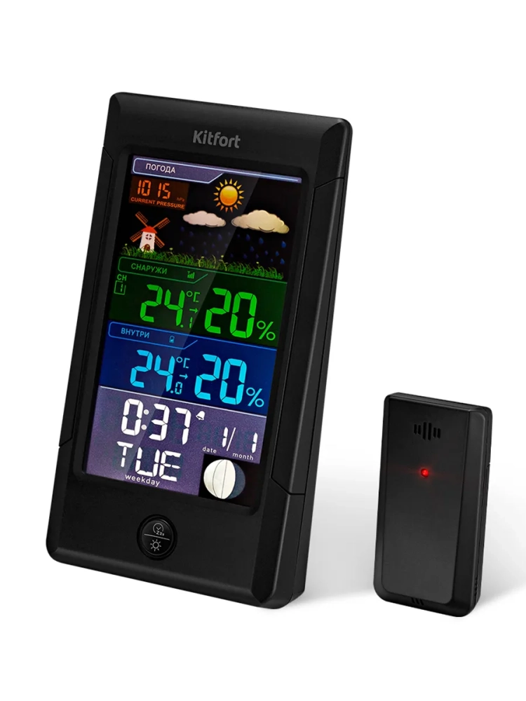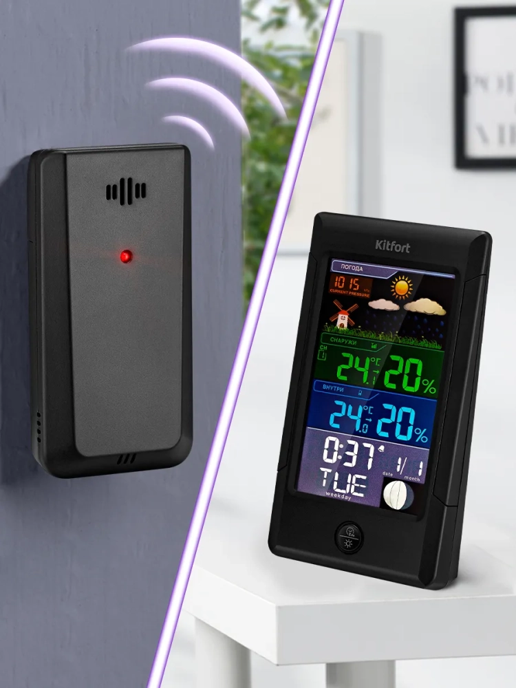 Метеостанция Kitfort KT-3322 — это прибор, который позволит следить за показаниями температуры и влажности в помещении и на улице, фазой луны, погодой, атмосферным давлением. Устройство прогнозирует погодные условия на ближайшие 12–24 часа на основе изменения атмосферного давления. Также KT-3322 показывает время, дату, день недели и может служить будильником. Сигнал будильника можно отложить на 10 минут. Метеостанция показывает тенденцию изменения температуры и влажности: повышение, понижение, без изменений. У данного устройства цветной экран, на котором хорошо видны все необходимые значения. Подсветка имеет 3 уровня яркости. Метеостанция может работать как через USB-шнур (входит в комплект), подключенный к компьютеру или пауэрбанку, так и от 3 щелочных батареек типа AA (не входят в комплект), благодаря чему ее можно расположить в любом удобном для вас месте. Благодаря широкому основанию, метеостанция устойчиво стоит на столе. Данная модель оснащена одним датчиком, у которого есть отверстие для настенного крепления, чтобы получать показания температуры и влажности снаружи помещения. Вы можете поместить датчик не на улице, а в другом помещении, но в этом случае прогноз погоды не сможет быть произведен. Питание датчика происходит от 2 щелочных батареек типа AAA (не входят в комплект). Благодаря стильному дизайну и компактному размеру метеостанция легко впишется в ваш интерьер.
