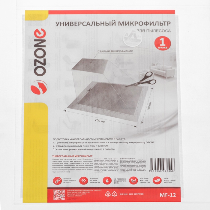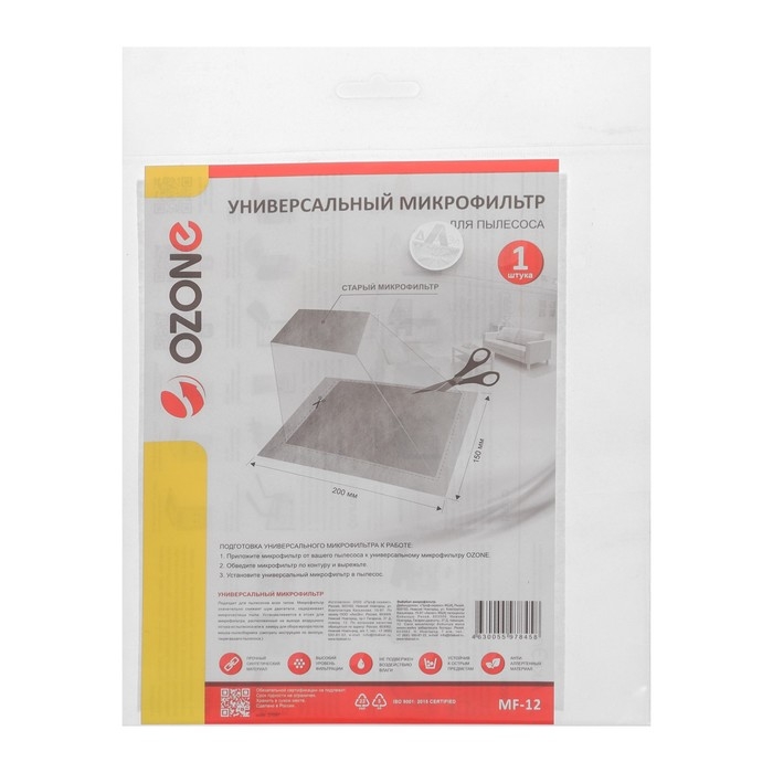Микрофильтр MF-12 Ozone является универсальным, что означает, что он подходит для многих моделей пылесосов разных производителей. Его размеры составляют 200х150 мм, что делает его подходящим для большинства стандартных пылесосов.