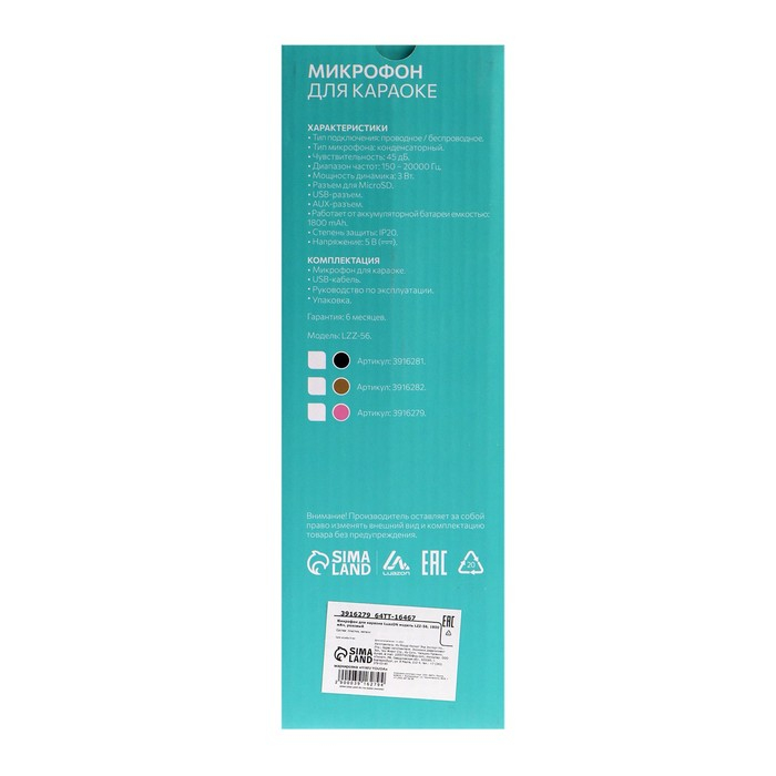 Микрофон для караоке LuazON LZZ-56, WS-858, 1800 мАч, чёрный