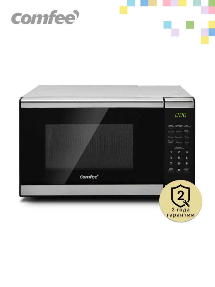 Стильная микроволновая печь Comfee CMG207E03S с кварцевым грилем и электронным кнопочным управлением станет незаменимой помощницей в вашем доме. Объем камеры 20 л. с максимальной мощностью микроволн 700 В 7 программ автоматического приготовления сократят время пригтовления некоторых продуктов. В данной модели доступны следующие режимы приготовления: авто разогрев, попкорн, картофель, пицца, напитки, мясо. Есть таймер на 99 мин, размораживание по весу. Быстрый старт одним нажатием кнопки упростит настройки приготовления. Благодаря наличию гриля можностью 1000Вт можно получить изумительную хрустящую корочку при приготовлении блюд. Решётка для гриля входит в комплект. Стильный LED дисплей с часами и нейтральной подсветкой,передняя панель в черном цвете c элементами из нержавеющей стали, корпус модели серебристый, внутреннее покрытие камеры эмаль легкой очистки. Звуковой сигнал по окончании программы.
