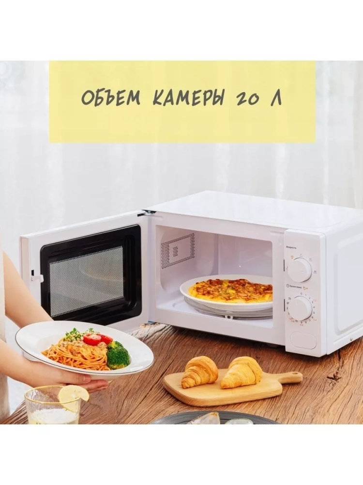 Объем печи составляет 20 литров, что позволяет готовить или разогревать большое количество пищи за один раз. Мощность микроволн в 700 Вт обеспечивает быстрый и равномерный нагрев продуктов.