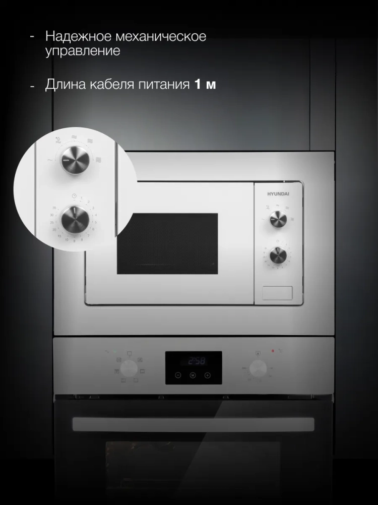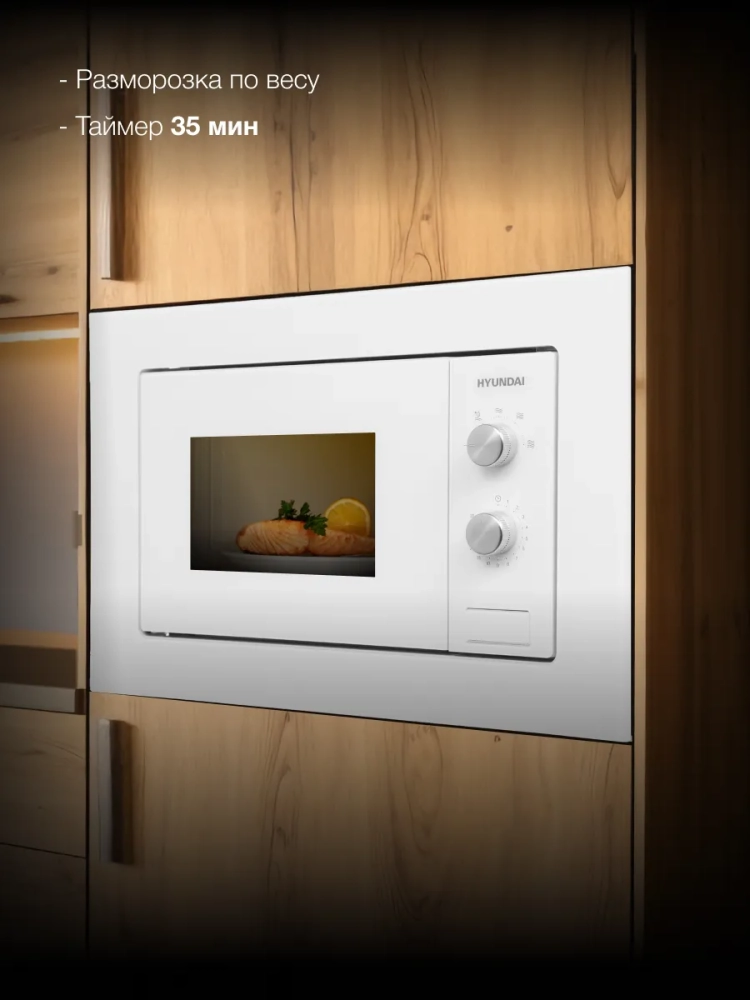 Встраиваемая микроволновая печь (СВЧ) Hyundai HBW 2030S WG белый, объем 20л., мощность микроволн 800Вт, покрытие камеры нержавеющая сталь.