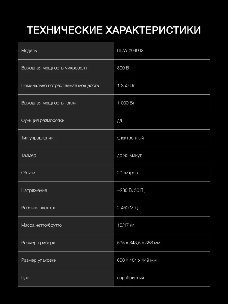 Если вы ищете надежную и эффективную микроволновую печь по доступной цене, то Hyundai HBW 2040 IX станет отличным выбором. Программы:Пицца, мясо, овощи, спагетти, картофель, рыба, напиток, попкорн