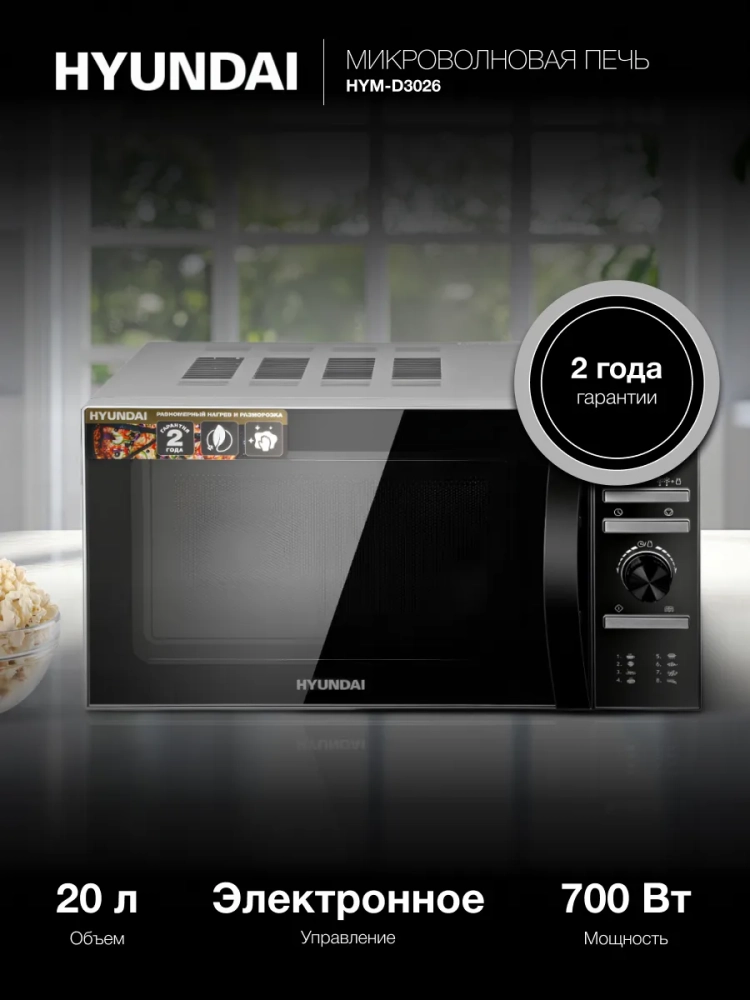 Микроволновая печь (СВЧ) Hyundai HYM-D3026 серебристый, мощность 700Вт, объем 20л, покрытие камеры жаропрочная эмаль, электронное управление.