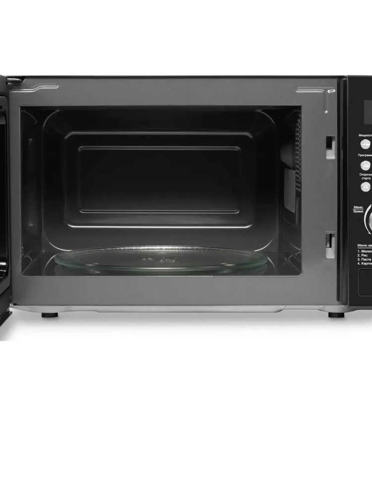 Микроволновка обладает вместительной внутренней камерой на 20 л. Этого объема с запасом хватит для приготовления и быстрого разогрева домашних блюд в небольшой семье. Модель оснащена поворотным столиком диаметром 24,5 см, который подойдет и для большой посуды. За счет вращения пища подогревается равномерно. Внутренняя подсветка позволит следить за процессом приготовления еды. Дверца микроволновки легко открывается одним нажатием на кнопку.