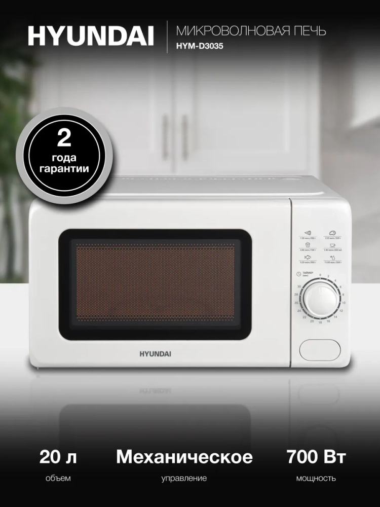 Микроволновая печь (СВЧ) Hyundai HYM-D3035 белый, мощность 700Вт, объем 20л, механическое управление.