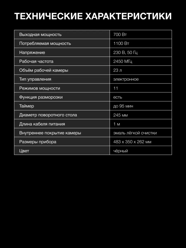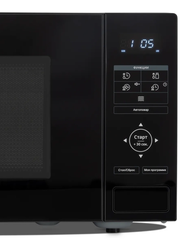 Управление дополнено удобным звуковым сигналом, оповещающим об окончании работы. Функционал устройства включает в себя автоматический разогрев и автоматическую готовку, а также режим «соло».