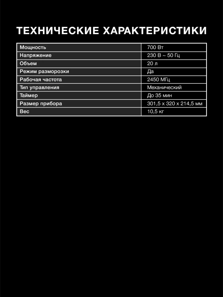 Вместительность камеры составляет 20 литров, что позволяет разогревать и готовить блюда для нескольких человек. Вращающийся поддон диаметром 245 мм подходит для посуды различных форм и размеров.