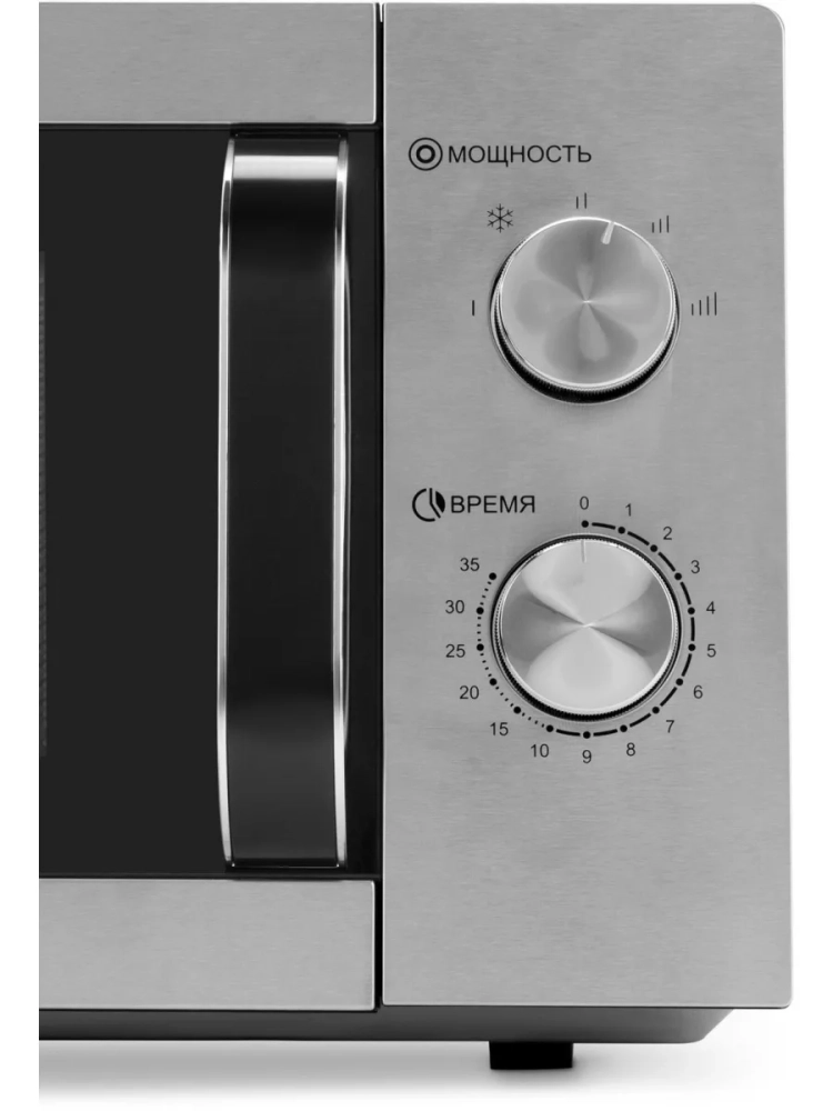 Панель управления отличается простотой и интуитивностью. Оснащена двумя поворотными регуляторами. Верхний регулятор отвечает за настройку уровня мощности, а нижний – за установку таймера.