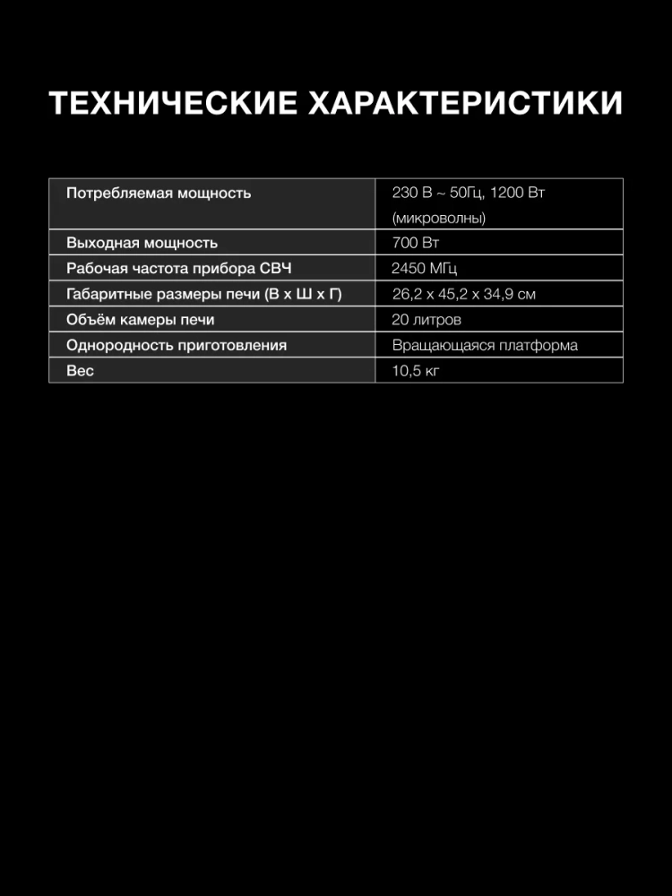 Для равномерного нагрева блюд используется поворотный стол диаметром 245 мм, который идеально подходит для большинства стандартных тарелок и контейнеров. Комбинация белого и черного цветов корпуса придаёт устройству элегантный и универсальный внешний вид.
